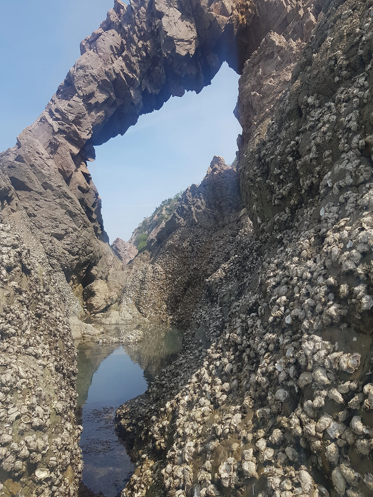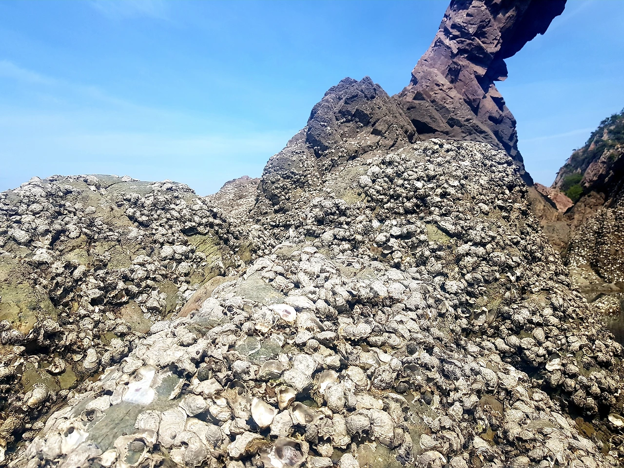 저 높이의 코끼리 코 윗부분에도 굴이 붙어 있고 코 밑 부분 바위에는 작은 굴들이 다닥다닥 붙어있어서 바위에 붙어 서서 작은 굴 하나를 벌려보니 알맹이가 있었다