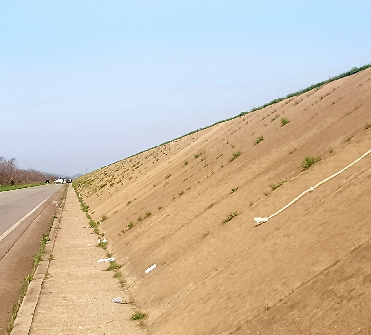 차를 멈추고 살펴보니 도로 건너 방조제에 등산할 때 거친 산길에 있을 것 같은 로프가 군데군데 매듭한 체 매달려 있었다