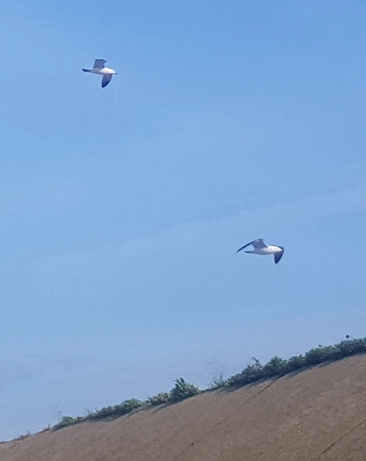 석문방조제 위에 올라 감탄에 빠져있는데 이보다 더 멋질 수 없다는 듯 갈매기 두 마리가 아주 평화롭게 우리를 향해 날아왔다