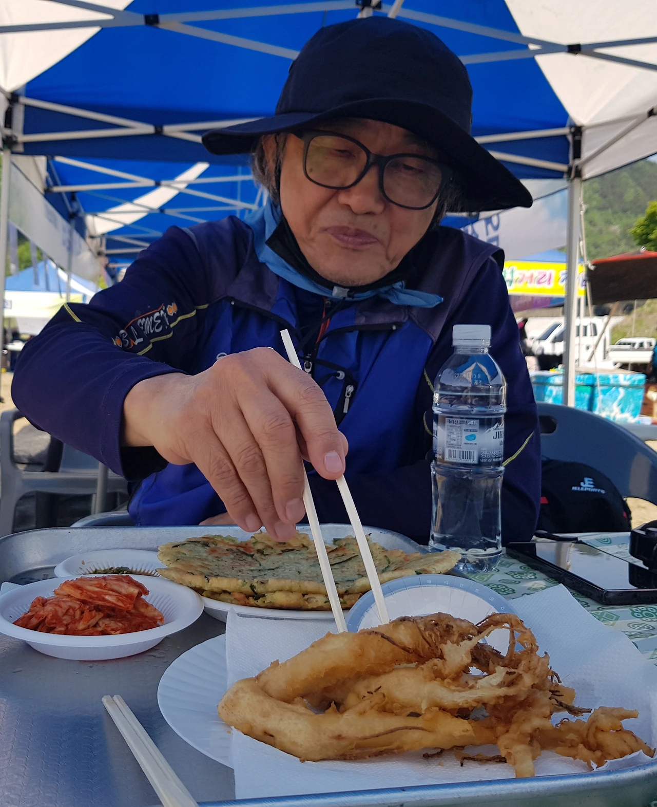 나루터를 돌아 나와 별신굿 하는 것을 구경하는데 햇볕이 너무 뜨거워 그늘을 찾아 먹거리 장소로 이동해서 그늘에 앉아 두 곳의 부녀회에서 주문한 인삼 튀김과 녹두전을 먹으며 운전을 위해 막걸리가 빠진 아쉬움을 달래고