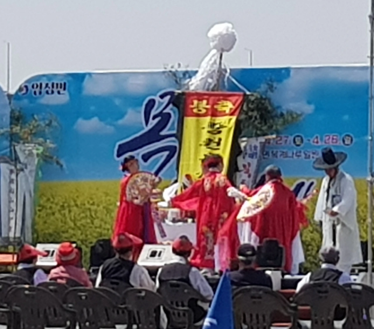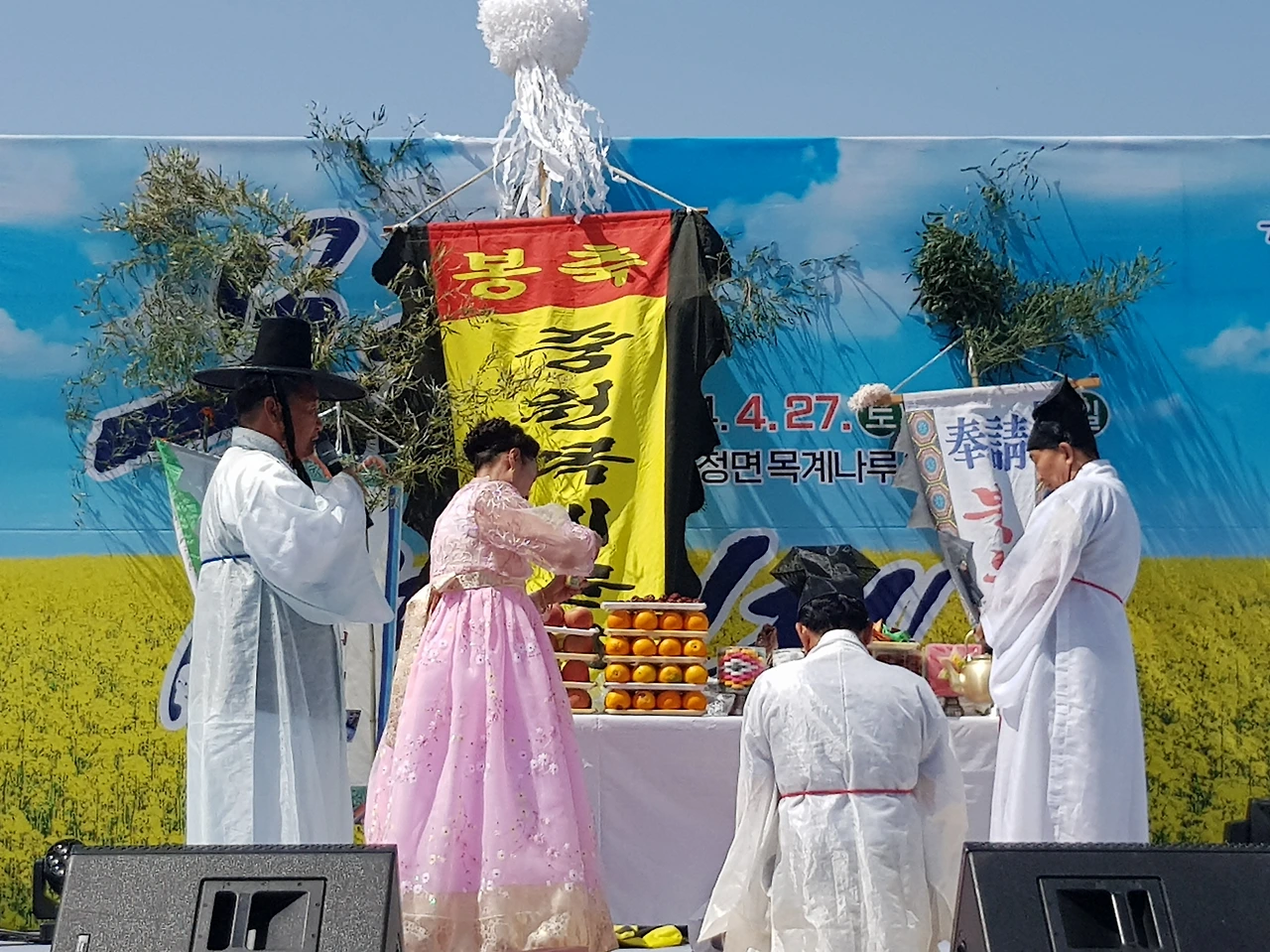 그곳에는 작은 무대에 갖은 음식이 차려지고 휘장도 펄럭이며 무대 위에는 제사를 지내고 있었다