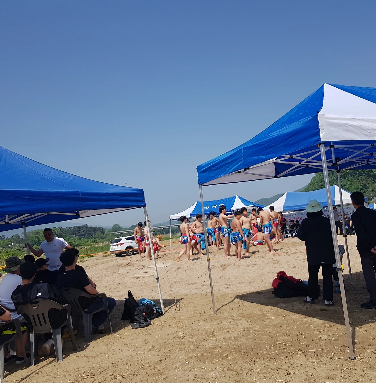 또 한쪽에서는 학생들의 씨름대회가 열리고 있었는데 간식거리 차 옆을 지나 나루터에 가려는데 멋진 가죽트레킹화를 펼쳐든 주인이 우리를 부르며 개시를 부탁한다