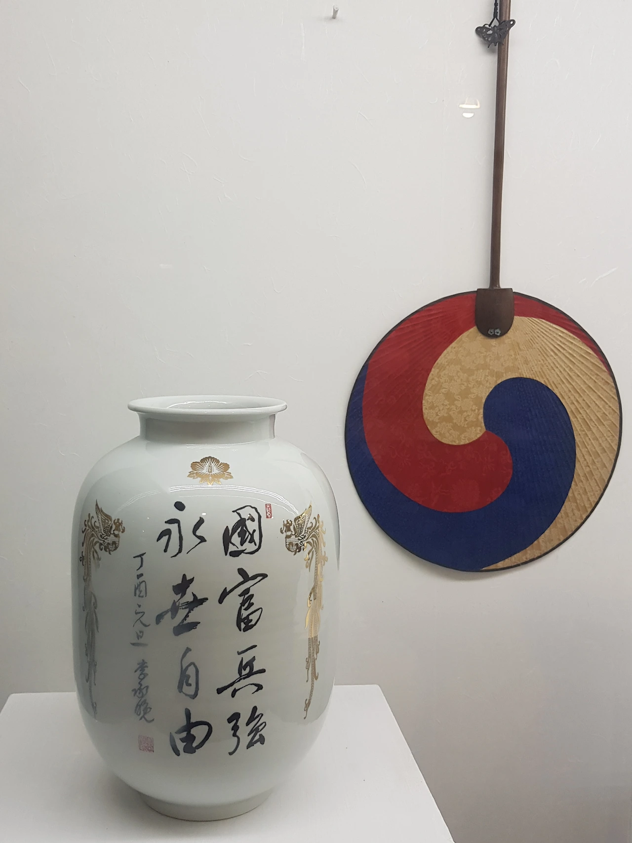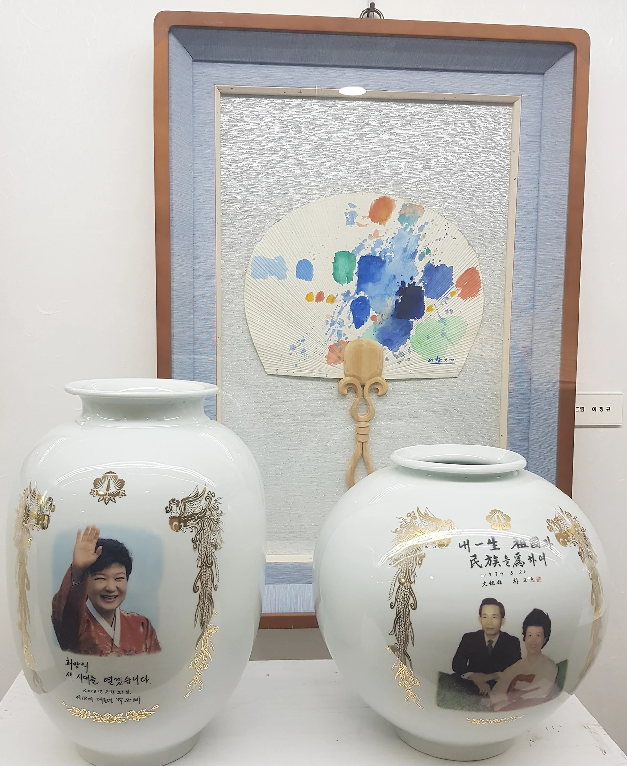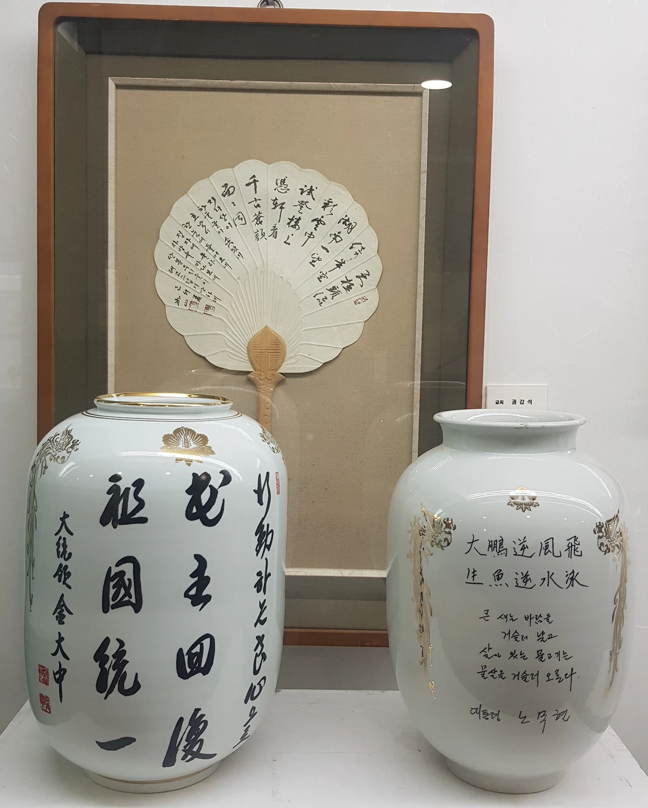 특이한 것은 현직, 전직 역대 대통령들의 이름이 세계진 도자기와 부채의 조화가 이루어져 전시되어 있었다