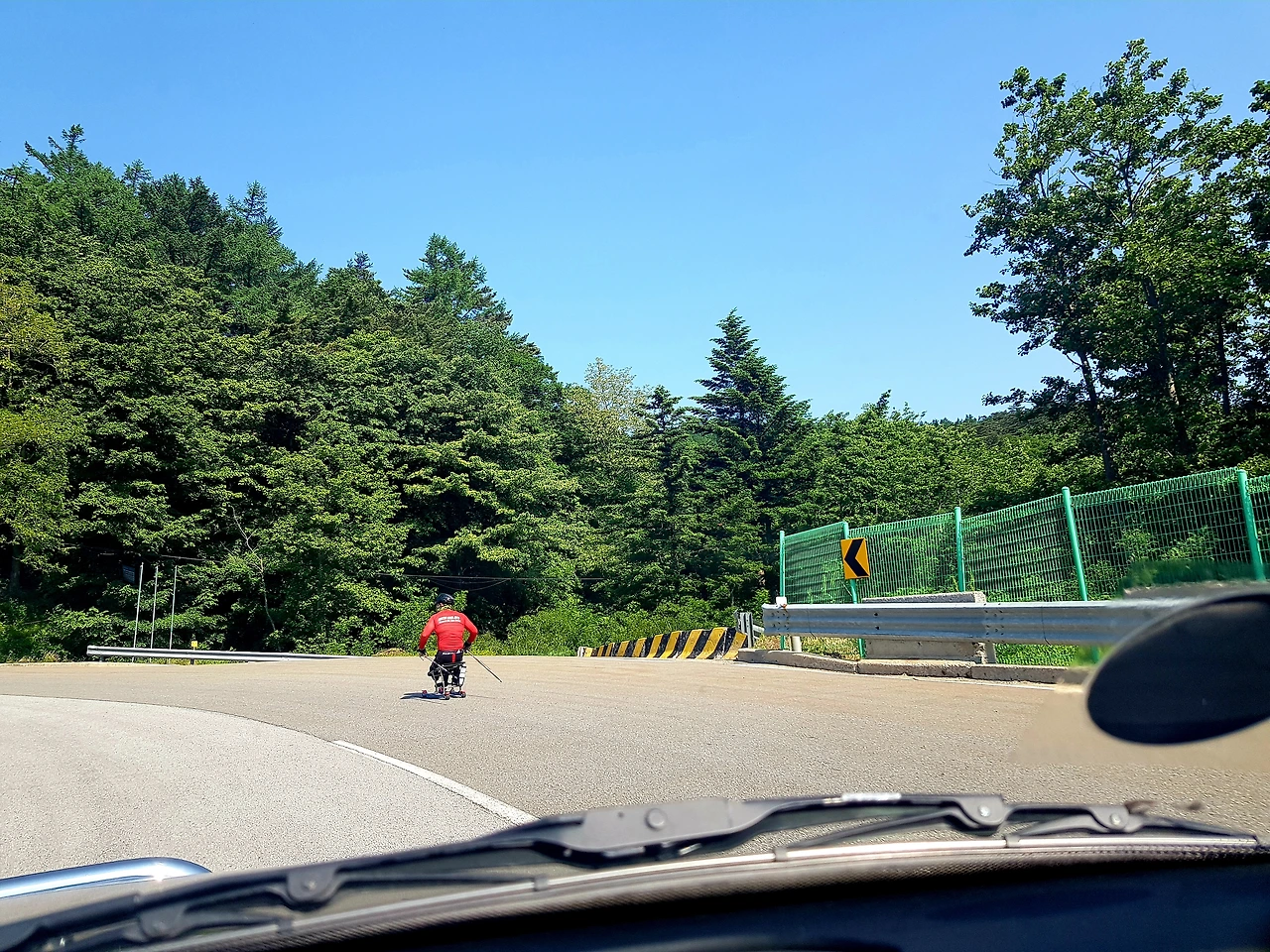낮은 자전거?를 타고 애써 페달을 밟으며 오르는 사람 뒤로 검은 차 한 대가 천천히 보호하며 따르고 있었다