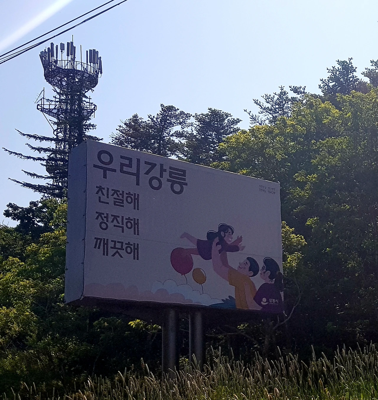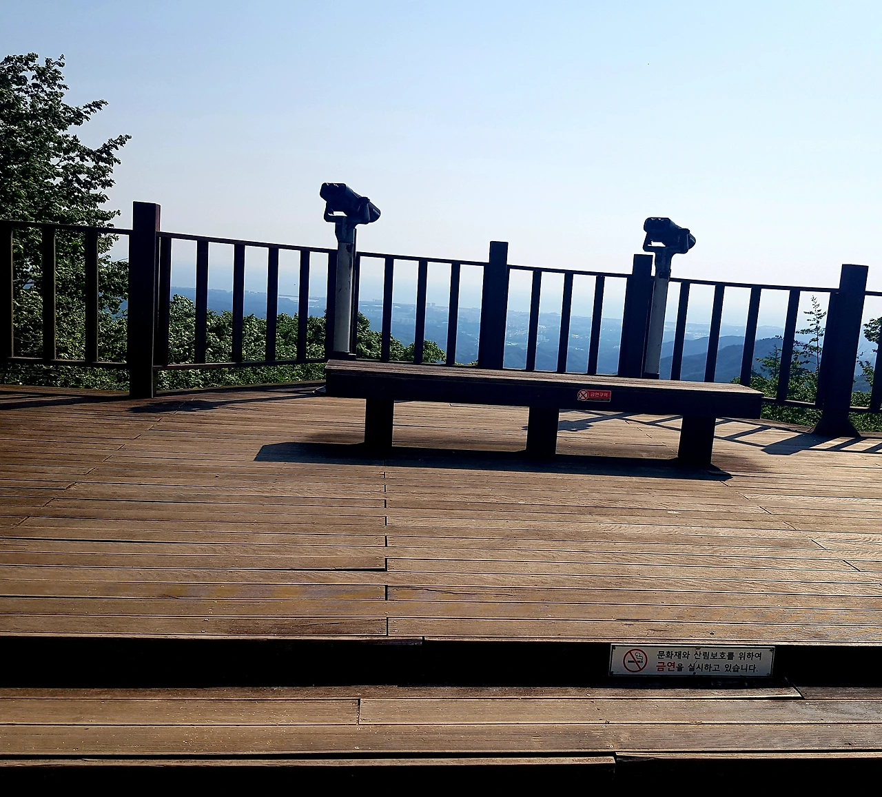 전망대가 있어 내려다보니 눈앞에 펼쳐진 푸르른 산들과 강릉시내가 눈에 들어와 잠시 쉬며 풍경에 잠겨있다