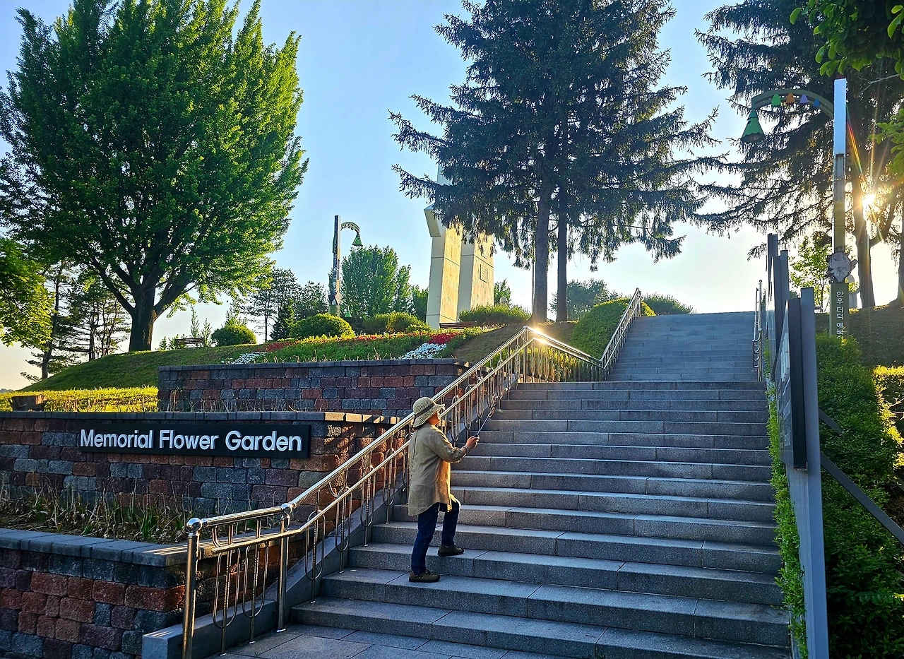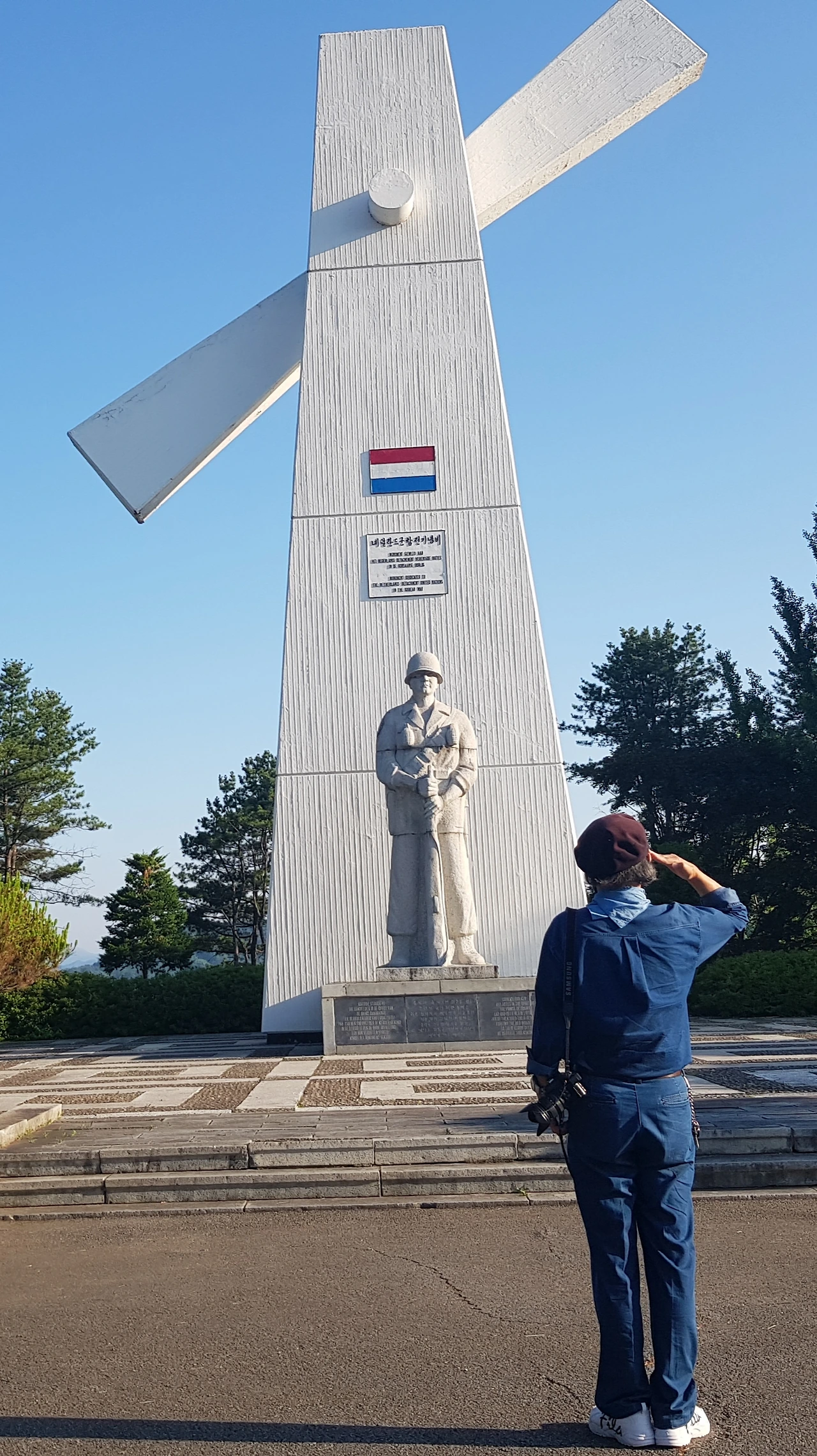 네덜란드 참전비와 국기 게양대에는 우리 국기와 네덜란드 기가 게양되어 있고 짝꿍은 참전비 앞에 서서 거수경례를 하고 있었다