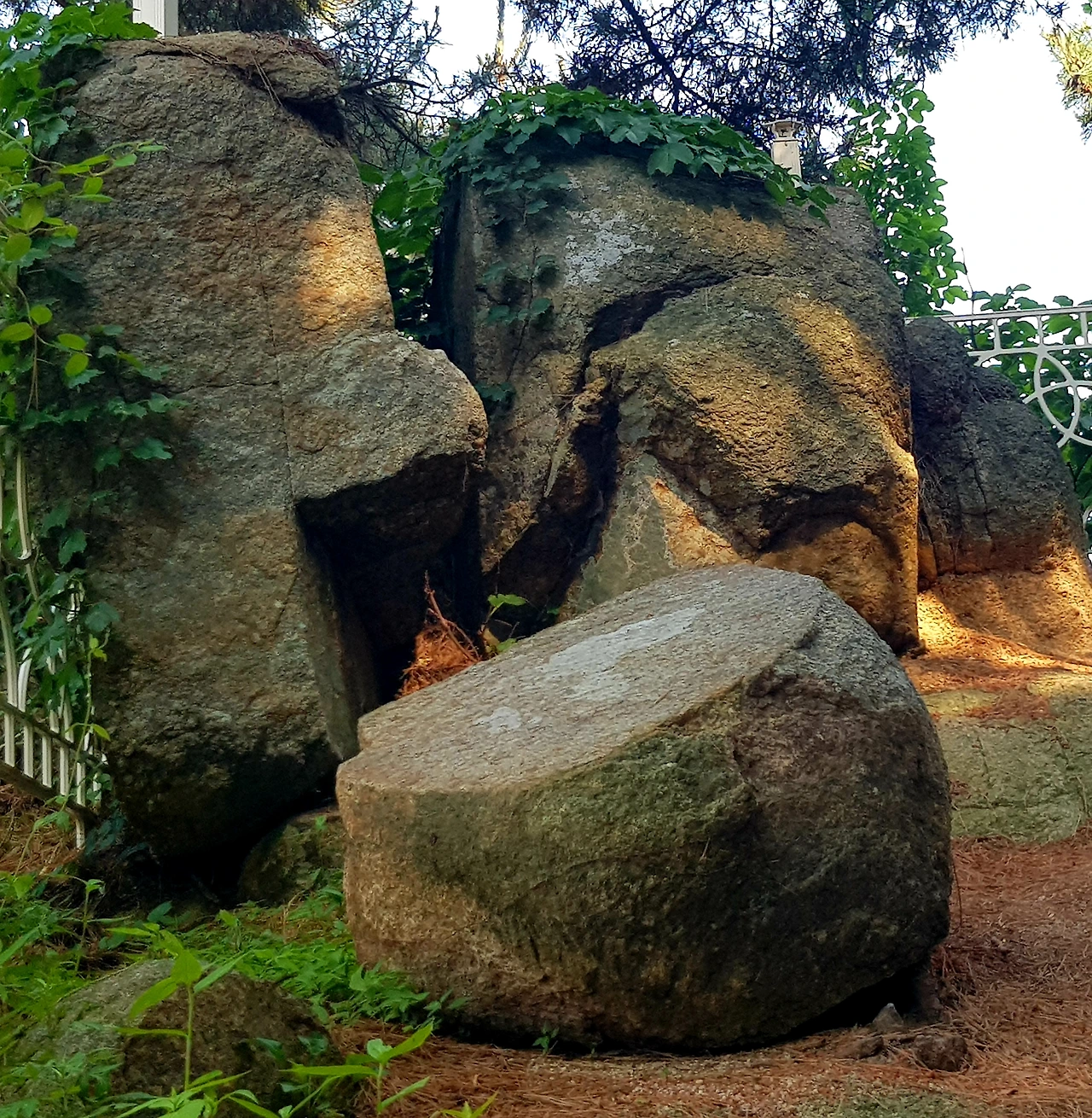 세월 입은 소나무가 서 있고 주변에 누워있는 바위도 예사롭지 않다