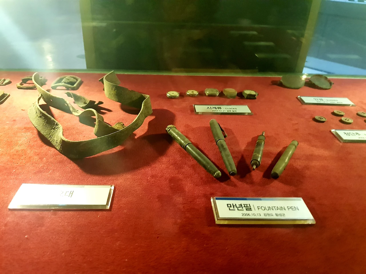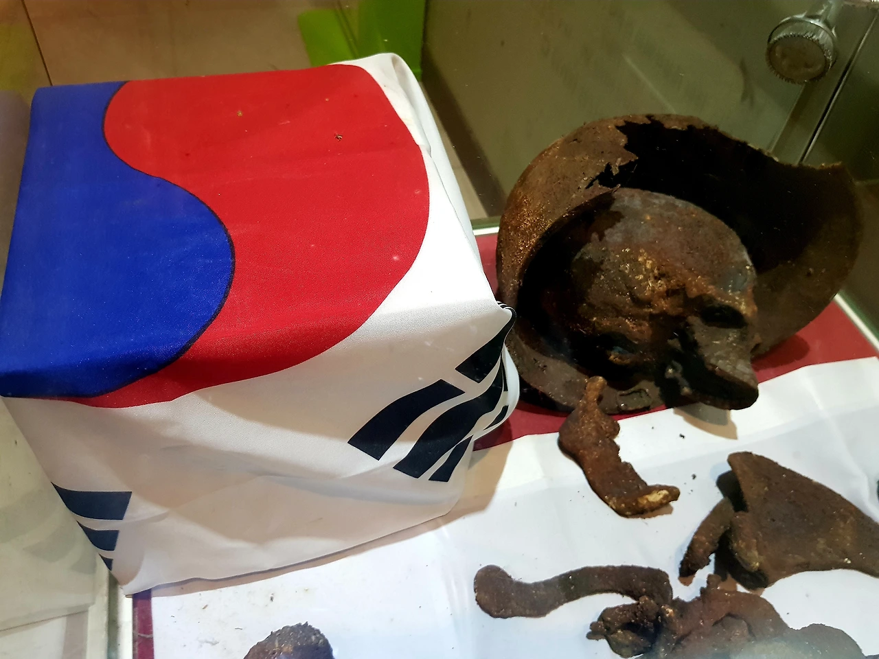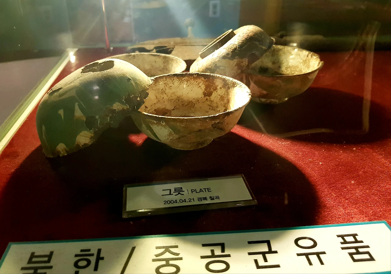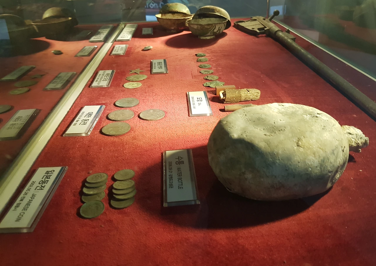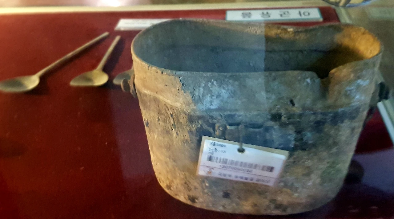 전쟁 중 유엔군과 국군 중공군 북한군들이 사용했던 유품들을 둘러보다 유골 한구를 마주한다