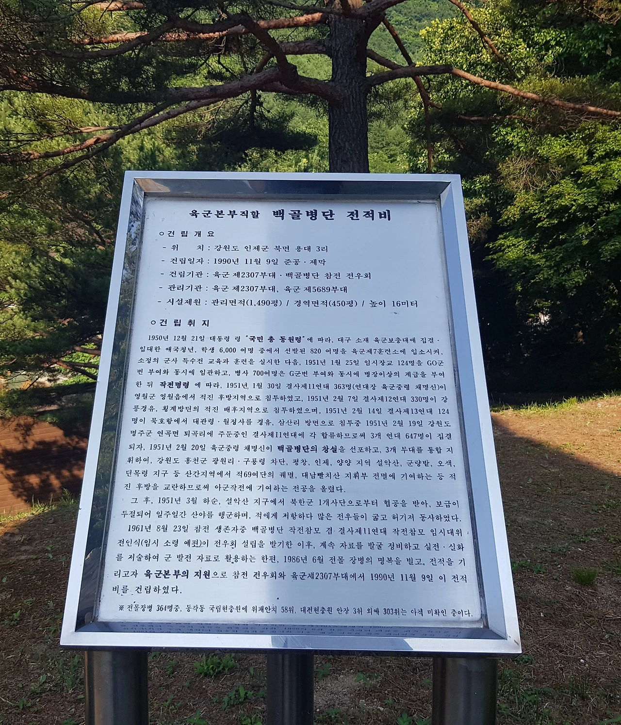 귀감으로 삼고자 육군의 예산지원과 백골병단 참전 전우 일동의 성금으로 이 비를 세운다ㅡㅡ라고