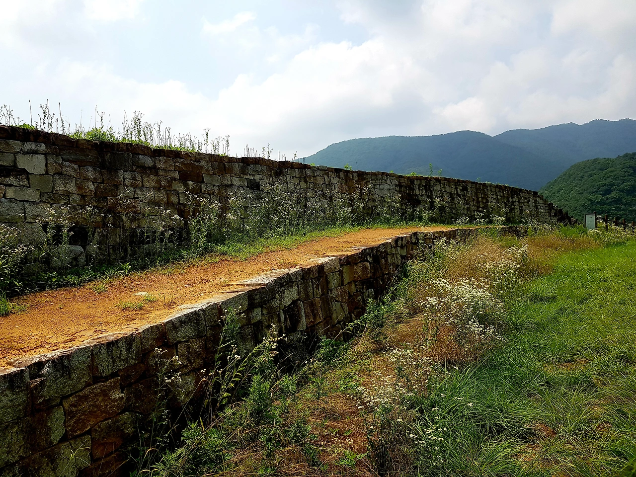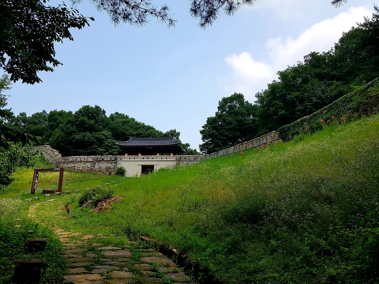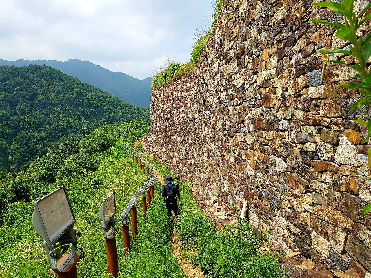숲길을 한참 오르다 보니 여름 들꽃이 지천인 너른 벌판 저 앞에 산성이 보인다