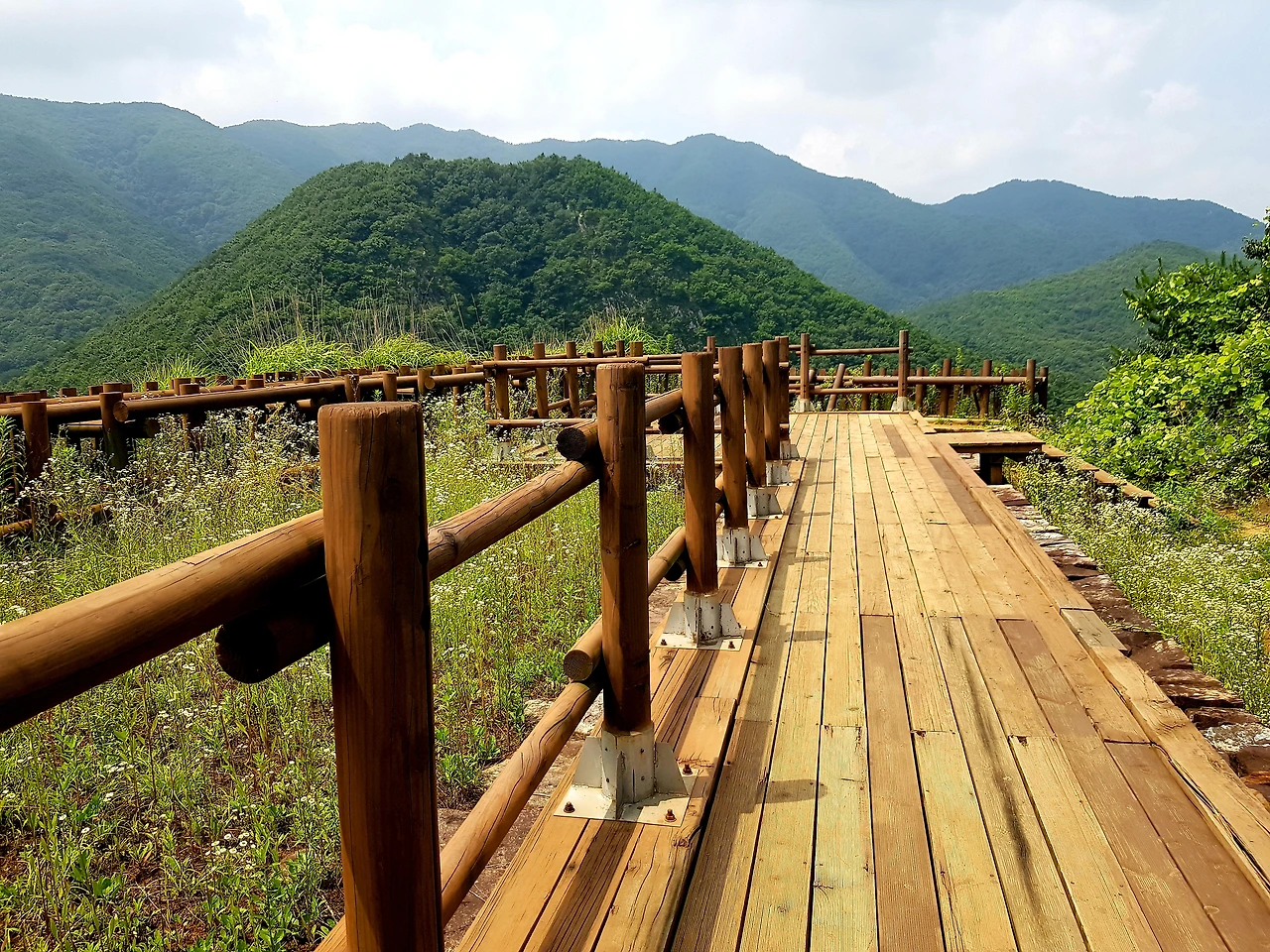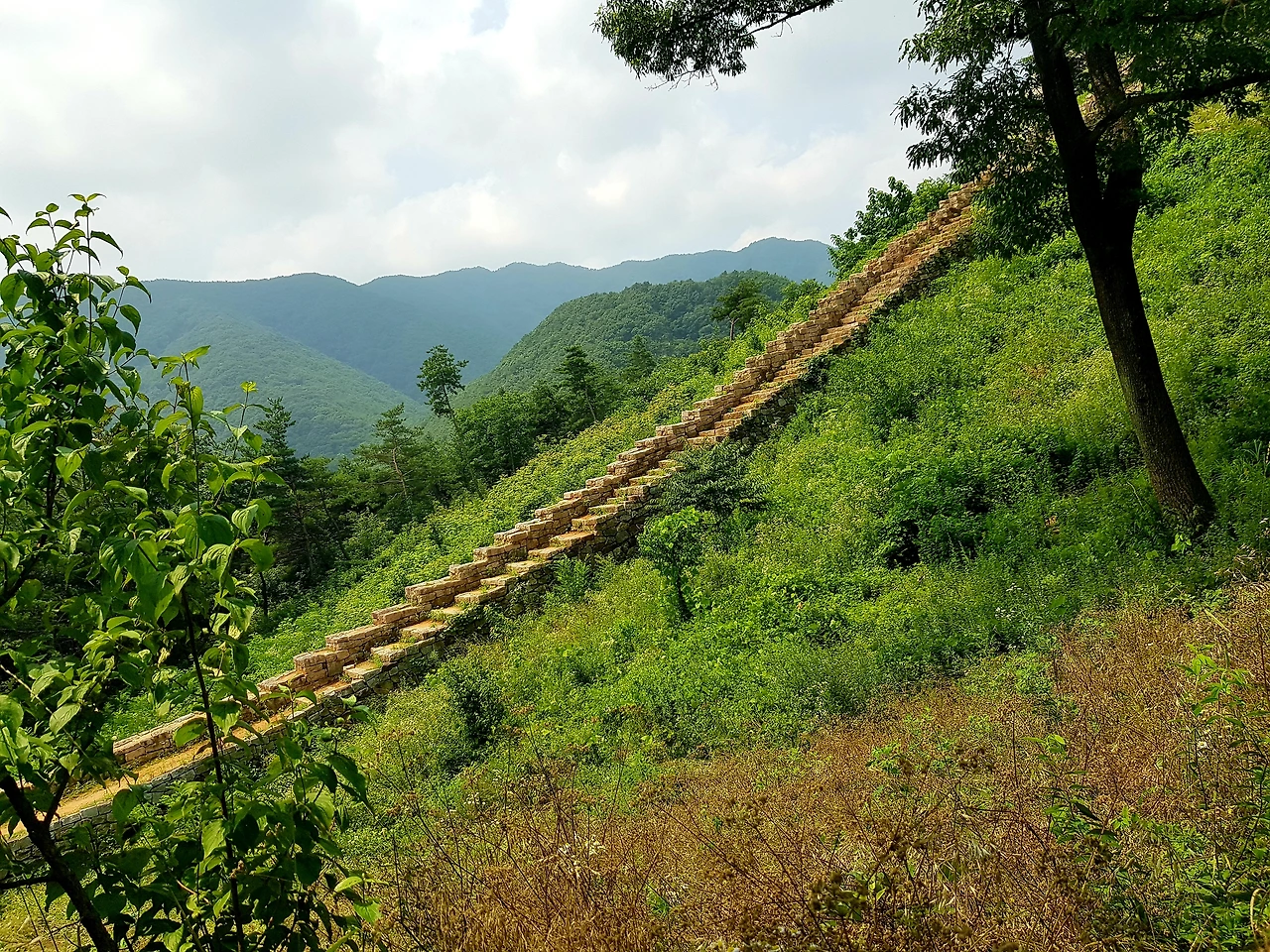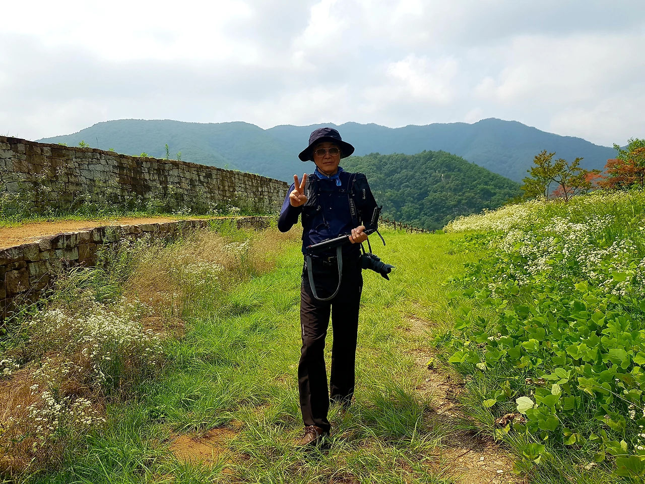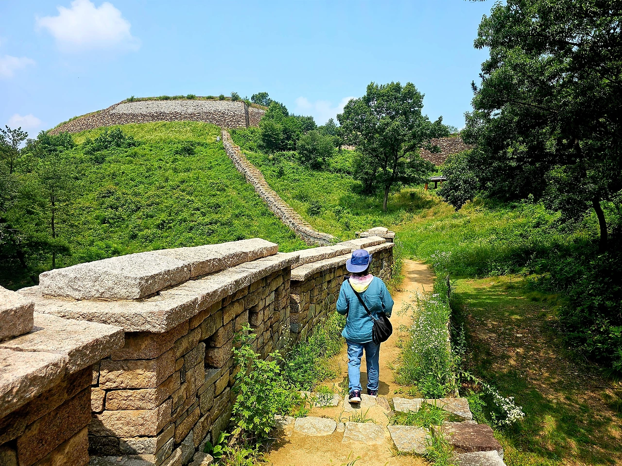 숲길을 한참 오르다 보니 여름 들꽃이 지천인 너른 벌판 저 앞에 산성이 보인다