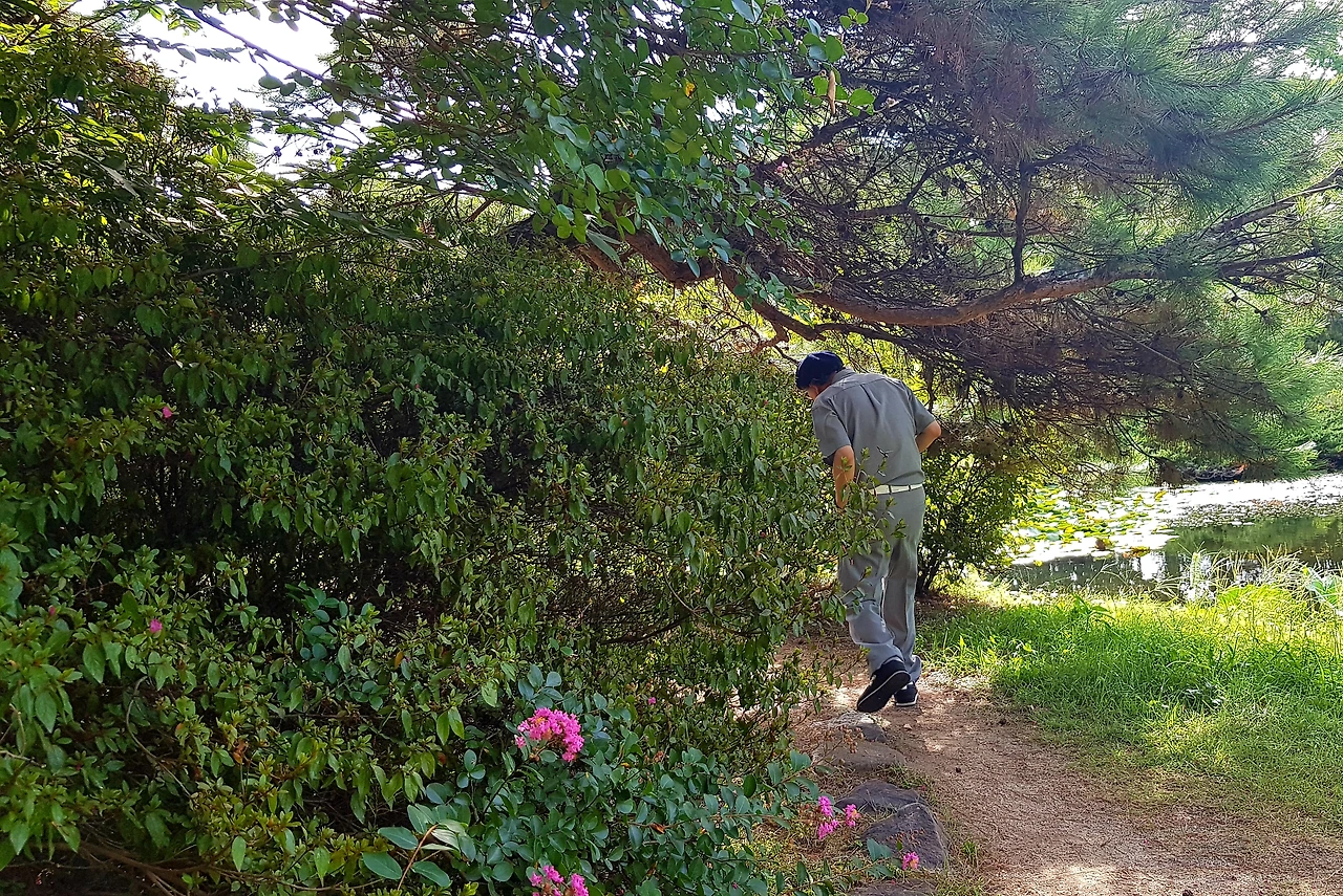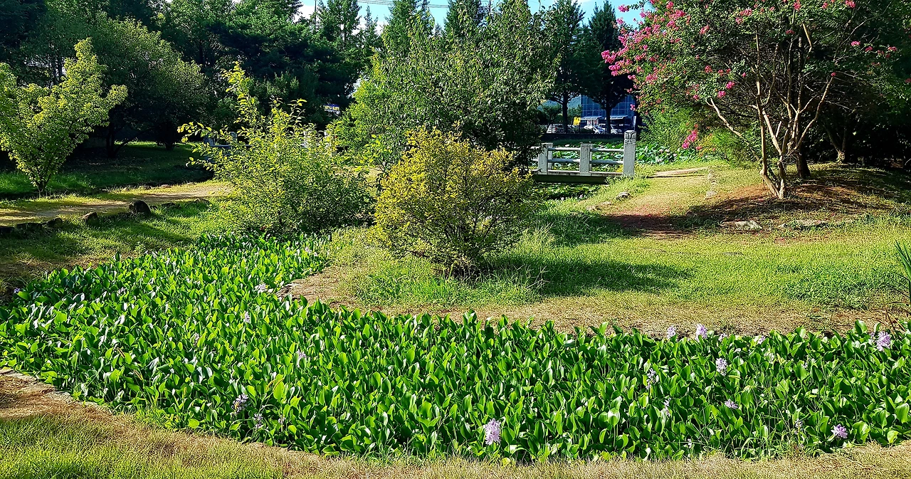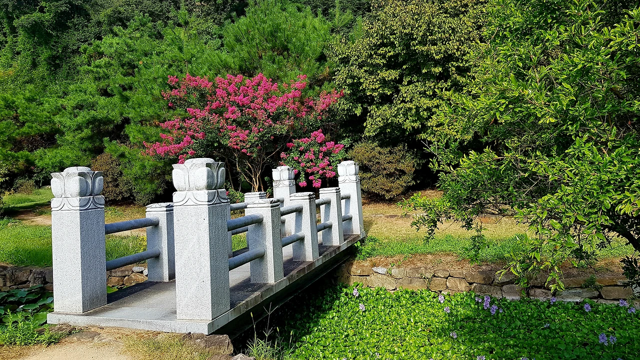 빨간 석류가 익어가고 대추나무의 대추도 가을빛을 따라가고 있었는데 나무가 아름답게 어우러진 길에는 허리를 숙이고 지나야 했으며 다리를 건너 잔잔한 보랏빛 꽃들이 반기는 길옆으로 작은 연못이었다