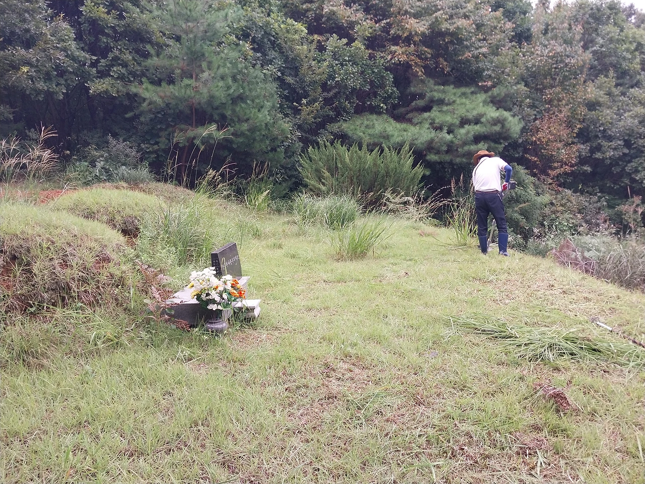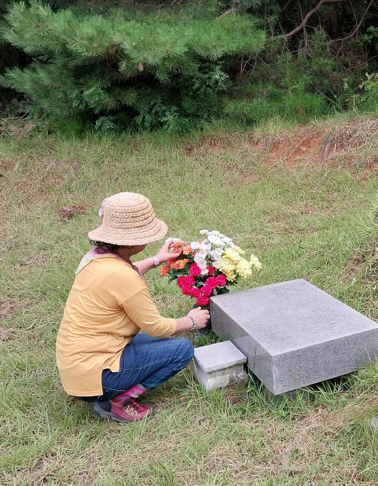 장비를 정리하고 손을 닦고 옷매무새를 바로 하고 상석을 깨끗하게 닦고는 준비해 간 꽃을 화병에 꽂고 커다란 배를 깎아 올리고 샤인머스켓도 올리고 막걸리를 잔에 따라 올린 후 우리는 묵념을 올렸다