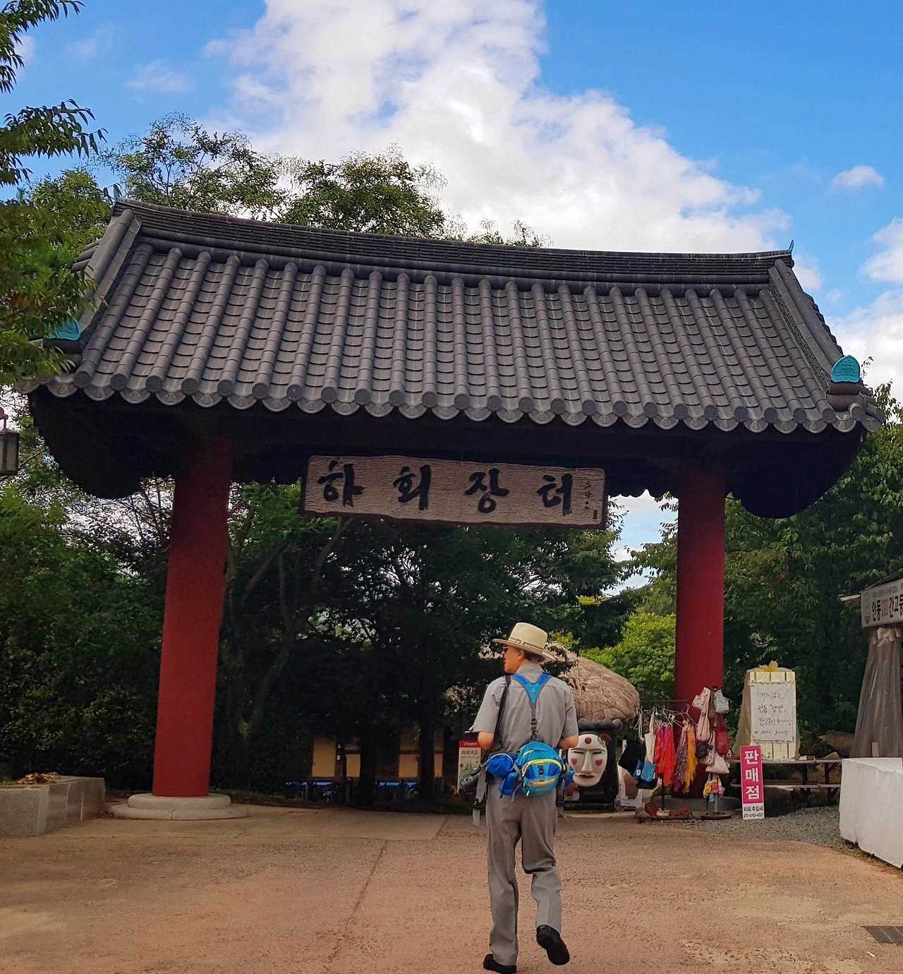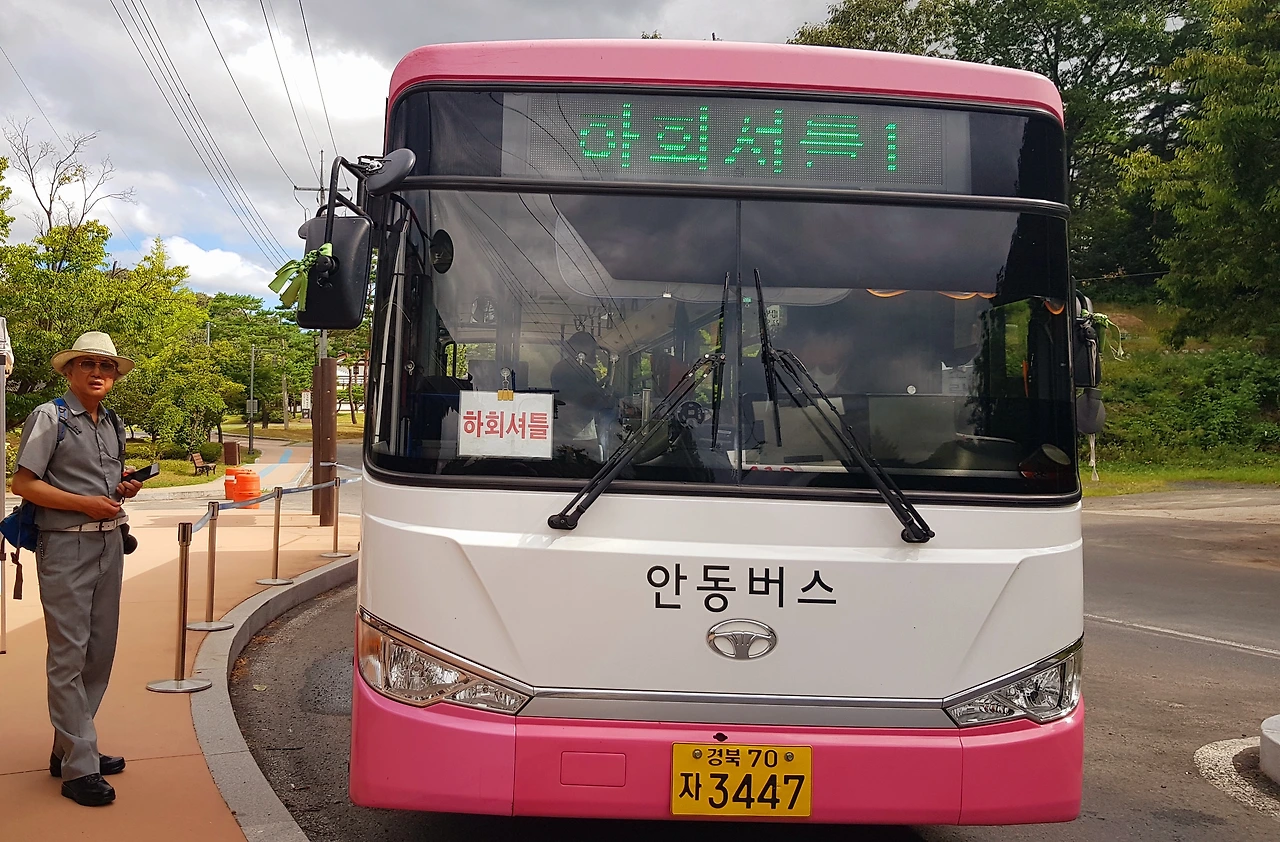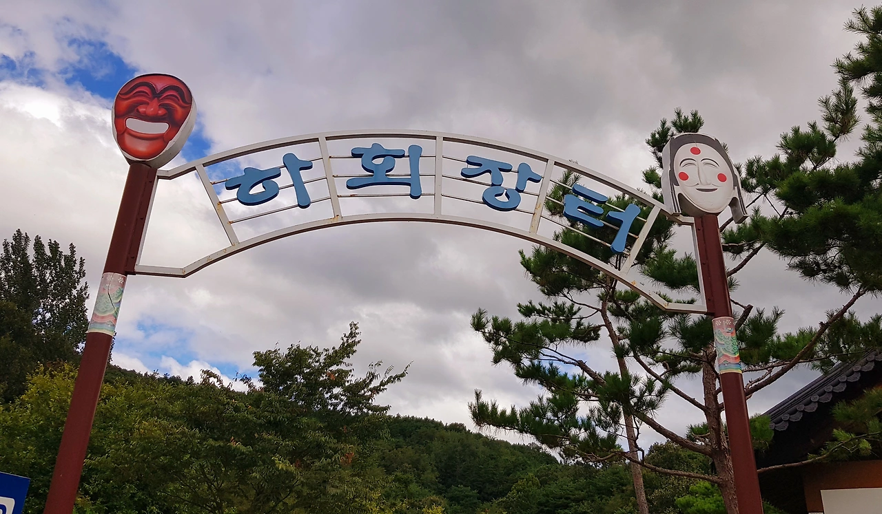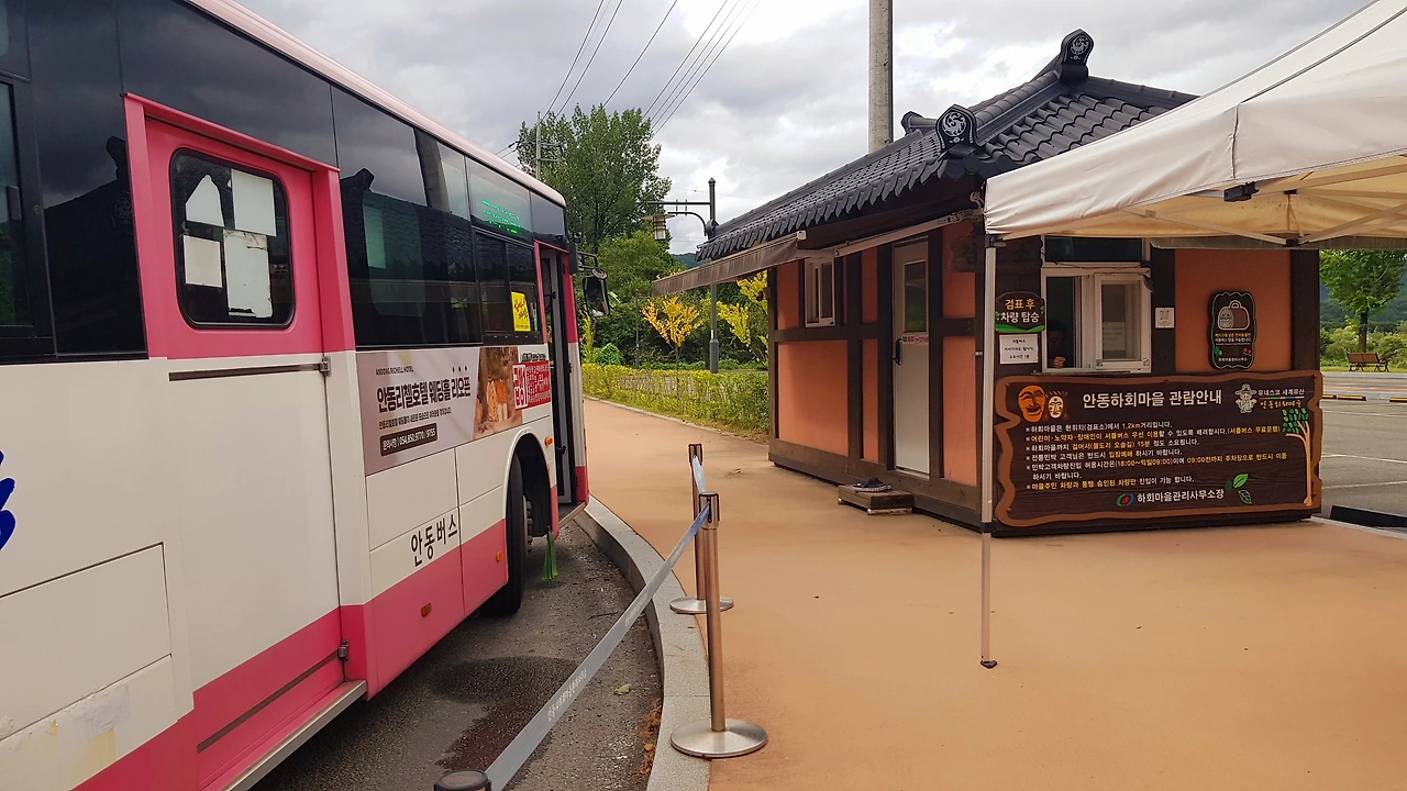난장 장터에는 손님을 기다리는 모자며 머플러 또 여러 가지 물품들 옆을 지나 하회장터 문을 통과하니 아담한 초가들이 빙그레 웃으며 반기지만 골목마다 아직 기지개를 켜지 않고 동네 가운데 멋진 정자가쉬어가라 했지만 목적지가 있어 인사만 하고 잠자고 있는 장터길을 돌아가 매표를 하고 하회마을행 버스를 타고 하회마을로가야 했다
