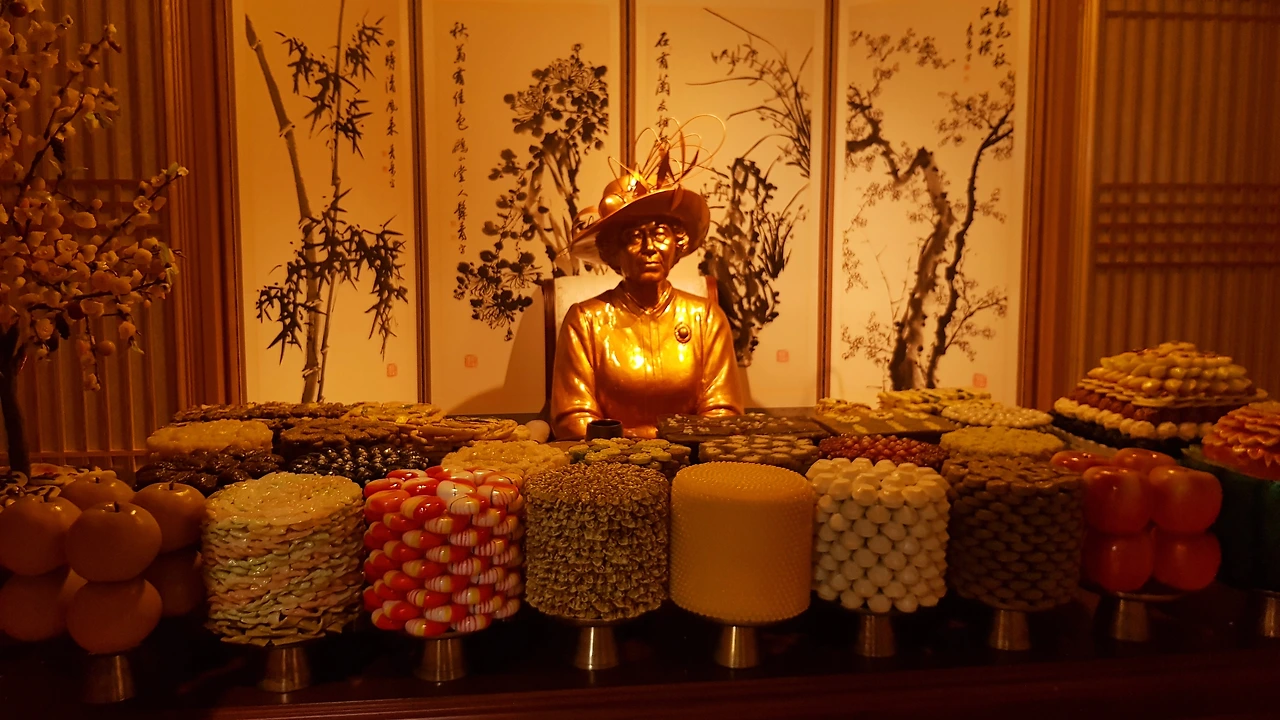 아담한 기념관에는 번쩍이는 황금칠을 한 그녀의 모형 앞에 칠순?을 기념하는 우리식의 잔치상이 차려져 있었다