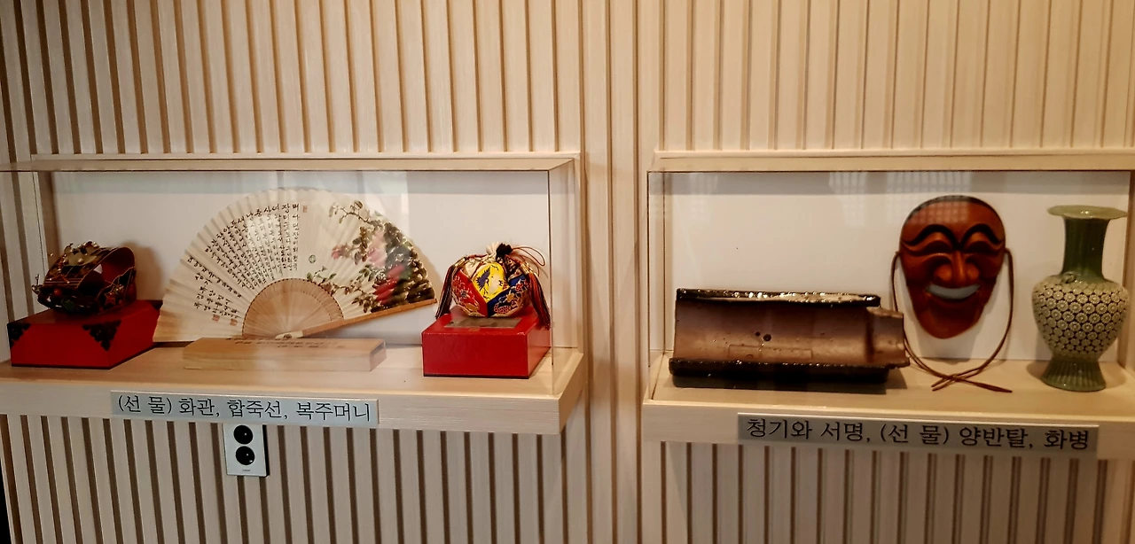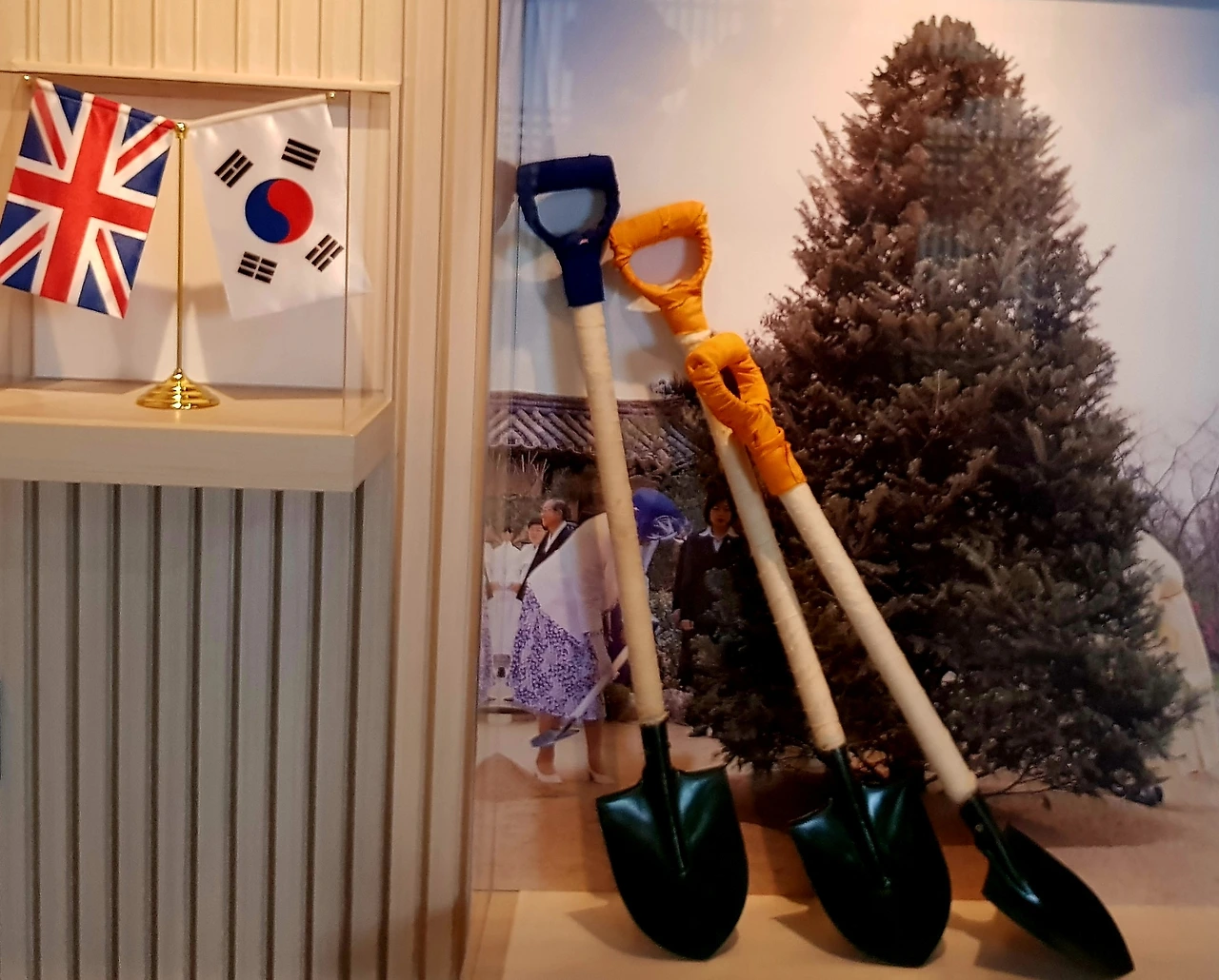 또 우리가 건넨 우리 문화 속의 선물 사진도 있고 소나무를 함께 심은 삽도 전시되어 있었다