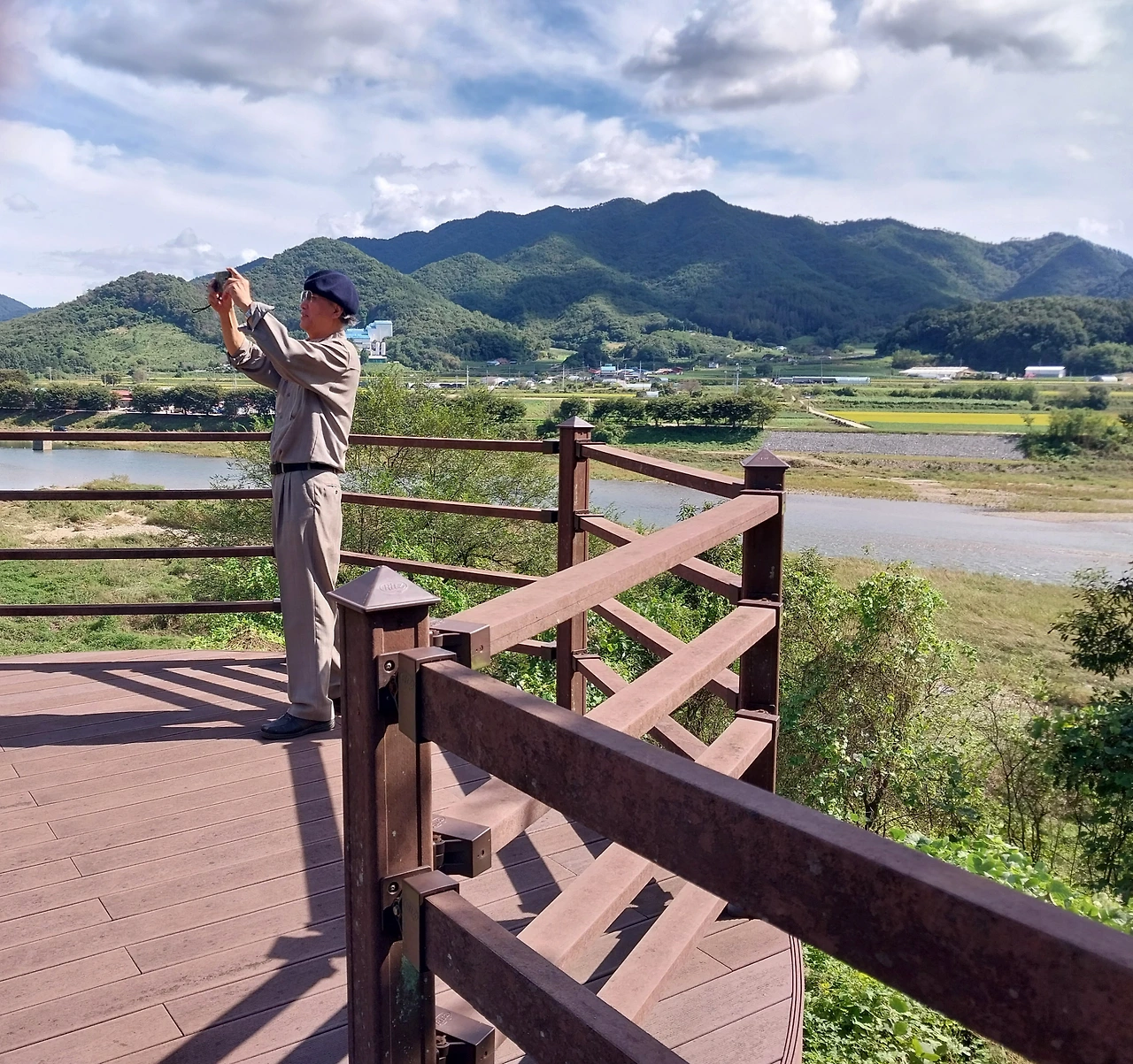 정자 앞으로 달천이 흐르고 높지 않은 푸른 산이 내려다보이는 평화롭고 아름다운