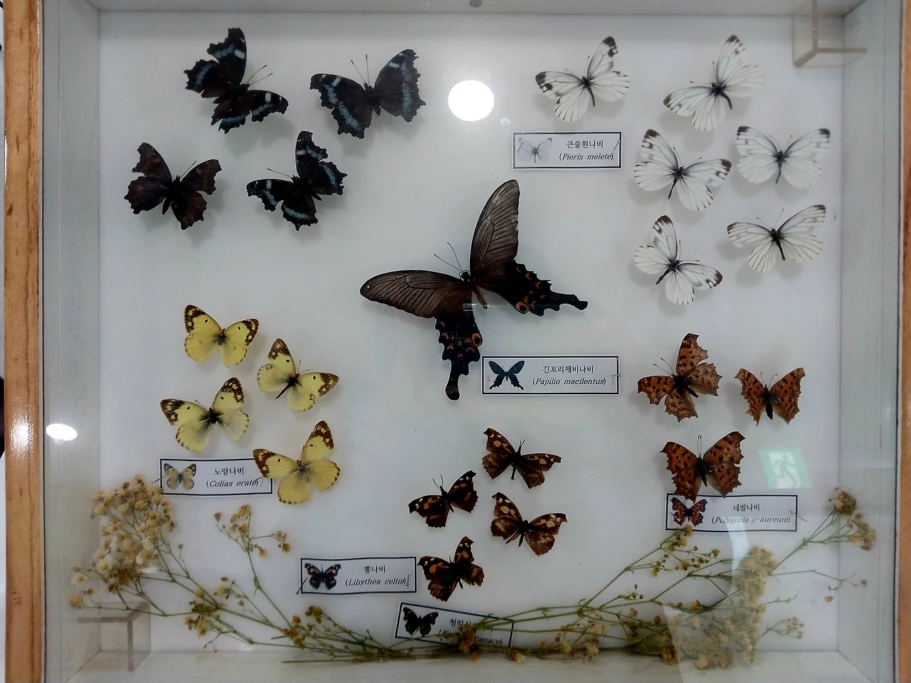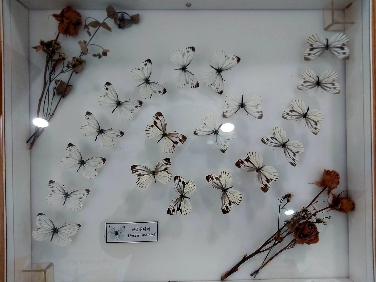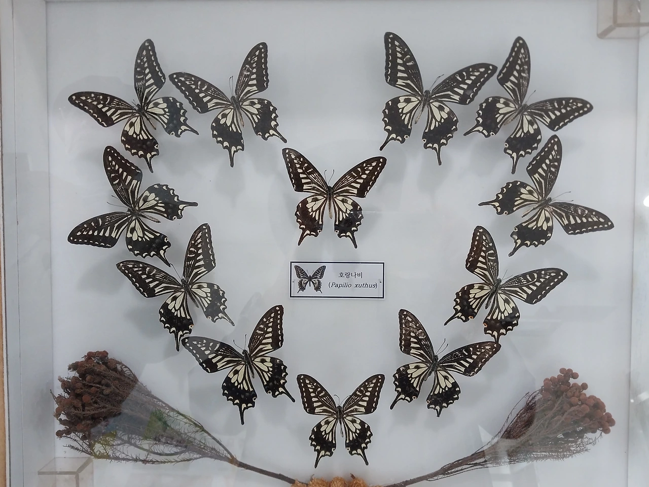 계단을 오르니 나비의 채집으로 여러 가지 문양을 만들어 전시를 하고 있었는데 예쁜 나비를 보고 순간 반가워 들여다보며 예쁘다는 생각과 저 나비들의 희생으로 관찰할 수 있다는 사실에 한쪽 마음은 아프게 다가온다
