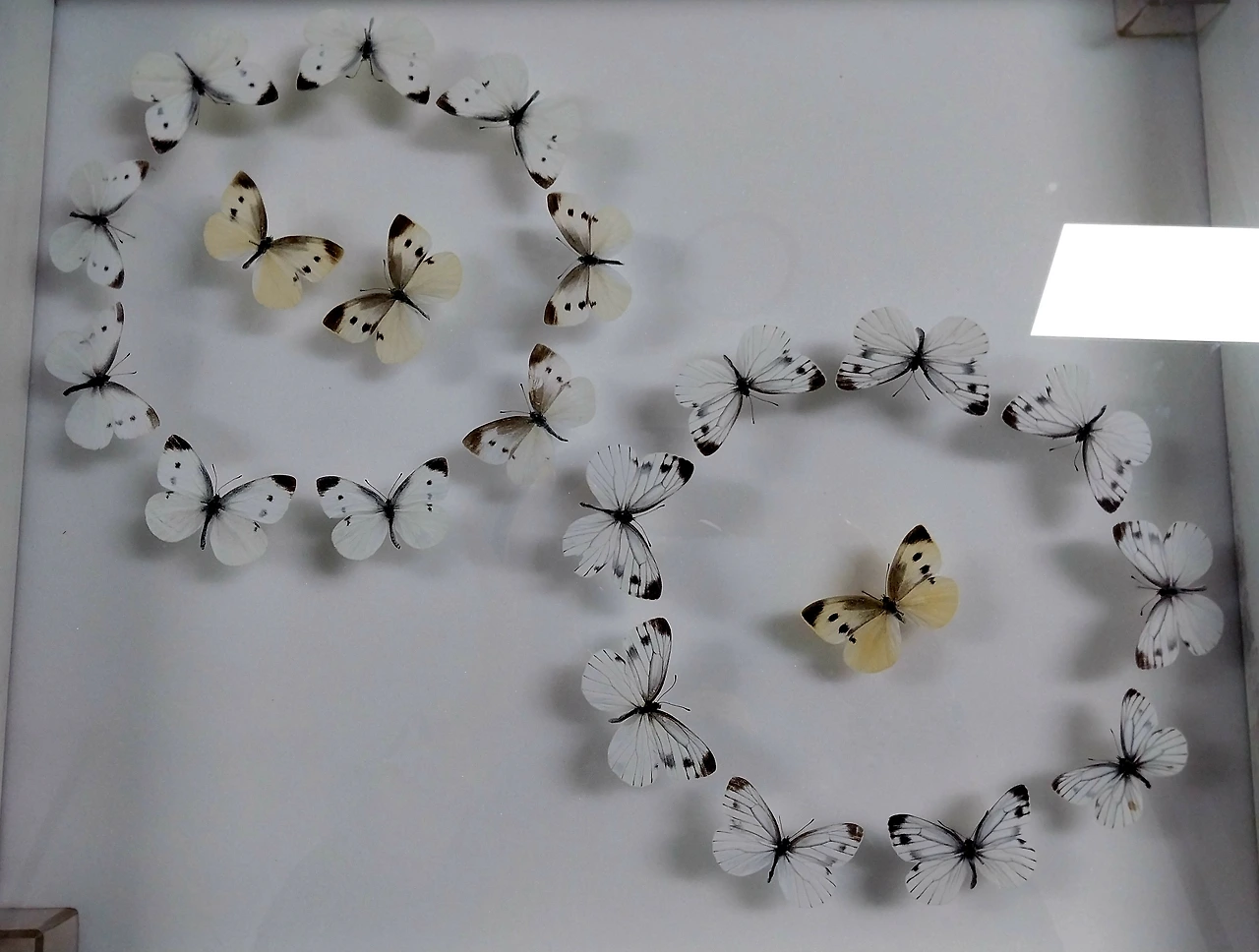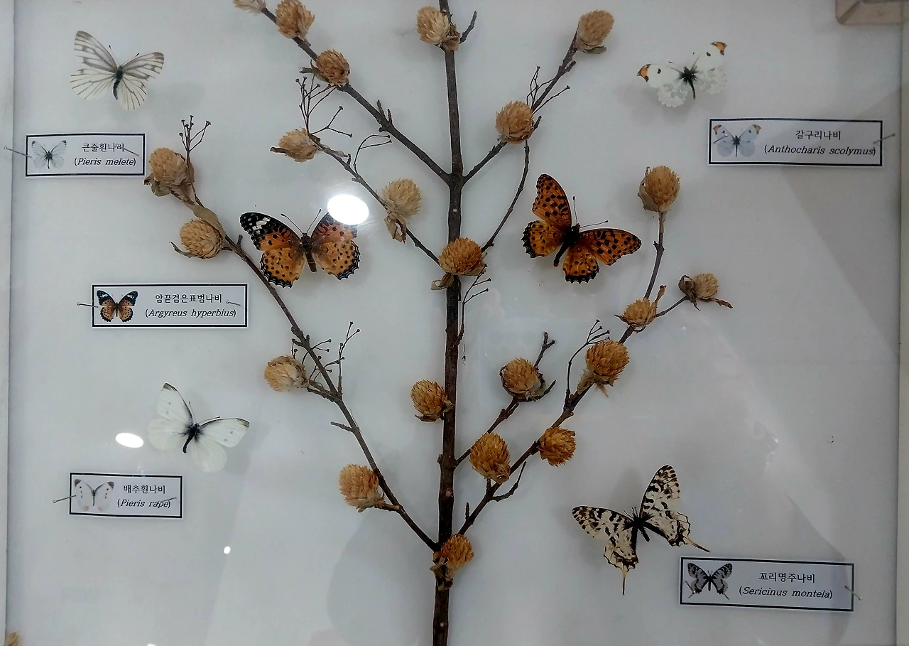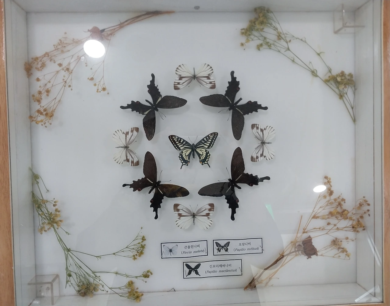 계단을 오르니 나비의 채집으로 여러 가지 문양을 만들어 전시를 하고 있었는데 예쁜 나비를 보고 순간 반가워 들여다보며 예쁘다는 생각과 저 나비들의 희생으로 관찰할 수 있다는 사실에 한쪽 마음은 아프게 다가온다
