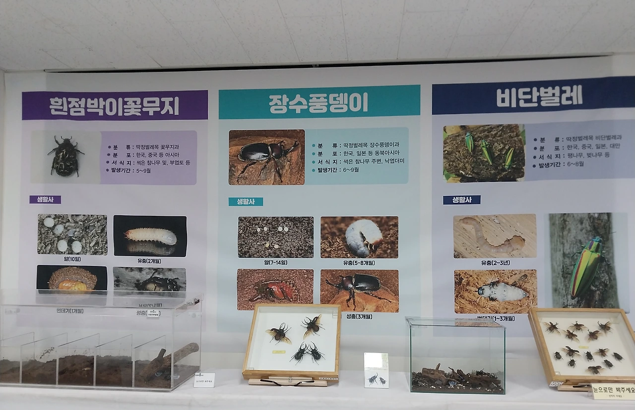 또 장수하늘소가 애벌레에서 깨어 나오는 모습도 있어 신기하기도 하고 걱정스럽기도 했는데 자연의 숲 속에서 날아다녀야 할 곤충들이 유리관 속에서 자유를 빼앗기고 있기에 한살이가 잘 이루어질까 걱정되기도 했다