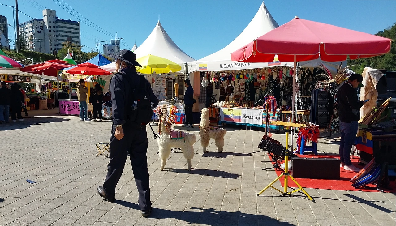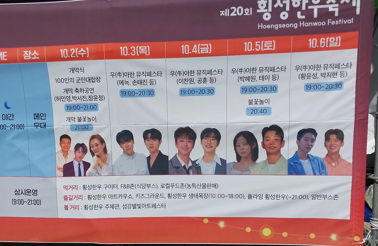 가수들의 팬들이 밀려오고 밤의 공연과 야경을 본 후 표고버섯을 두 자루 사다 카홈 밖에 시원하게 묶어두고 밤이 지난 아침 문을 연 시간에 다시 행사장에 들러 어제 찜해두었던 꼬리를 우리 것과 지인 것을 사니 잡뼈 두 보따리를 서비스로 주어 묵직하게 들고 카홈으로 가는 길에 음악당? 작은 무대가 있어 한곡 뽑아도 될까요?라고 하자 짝꿍 한마디
