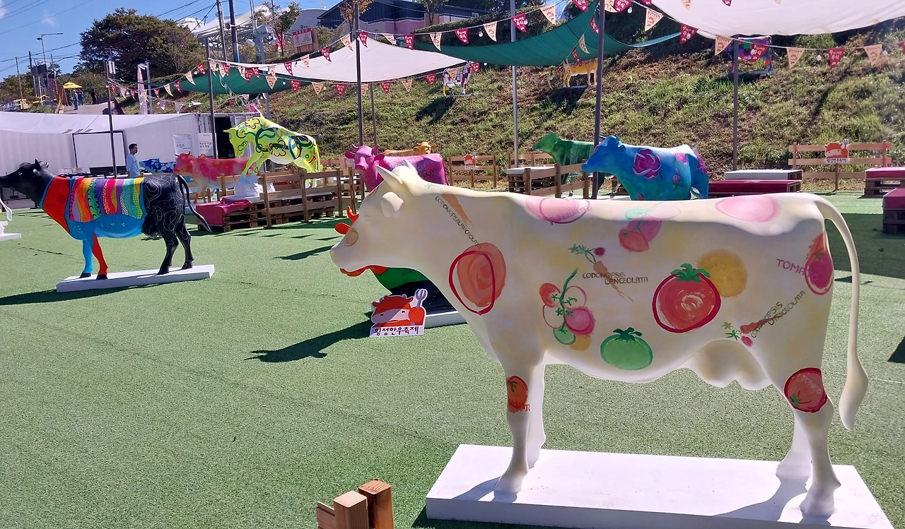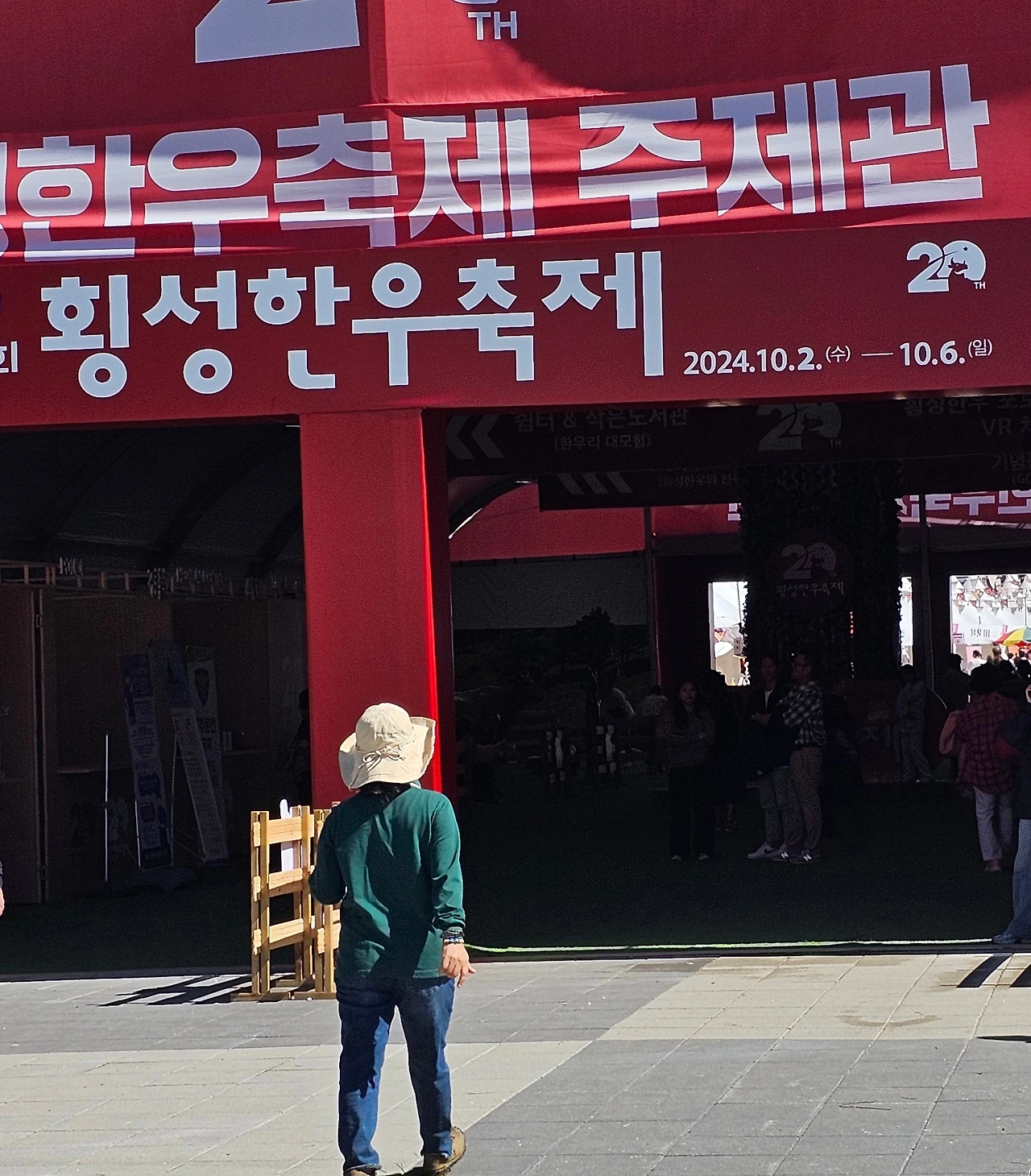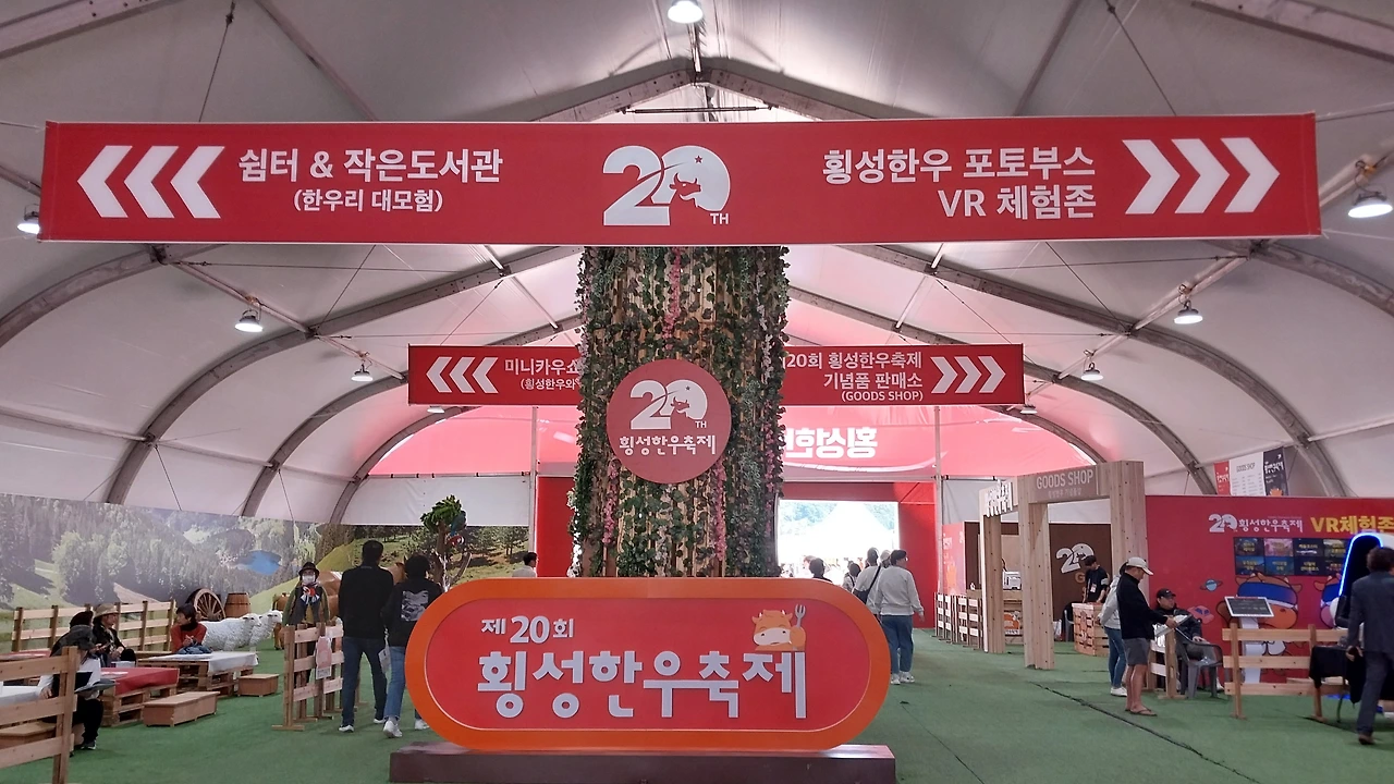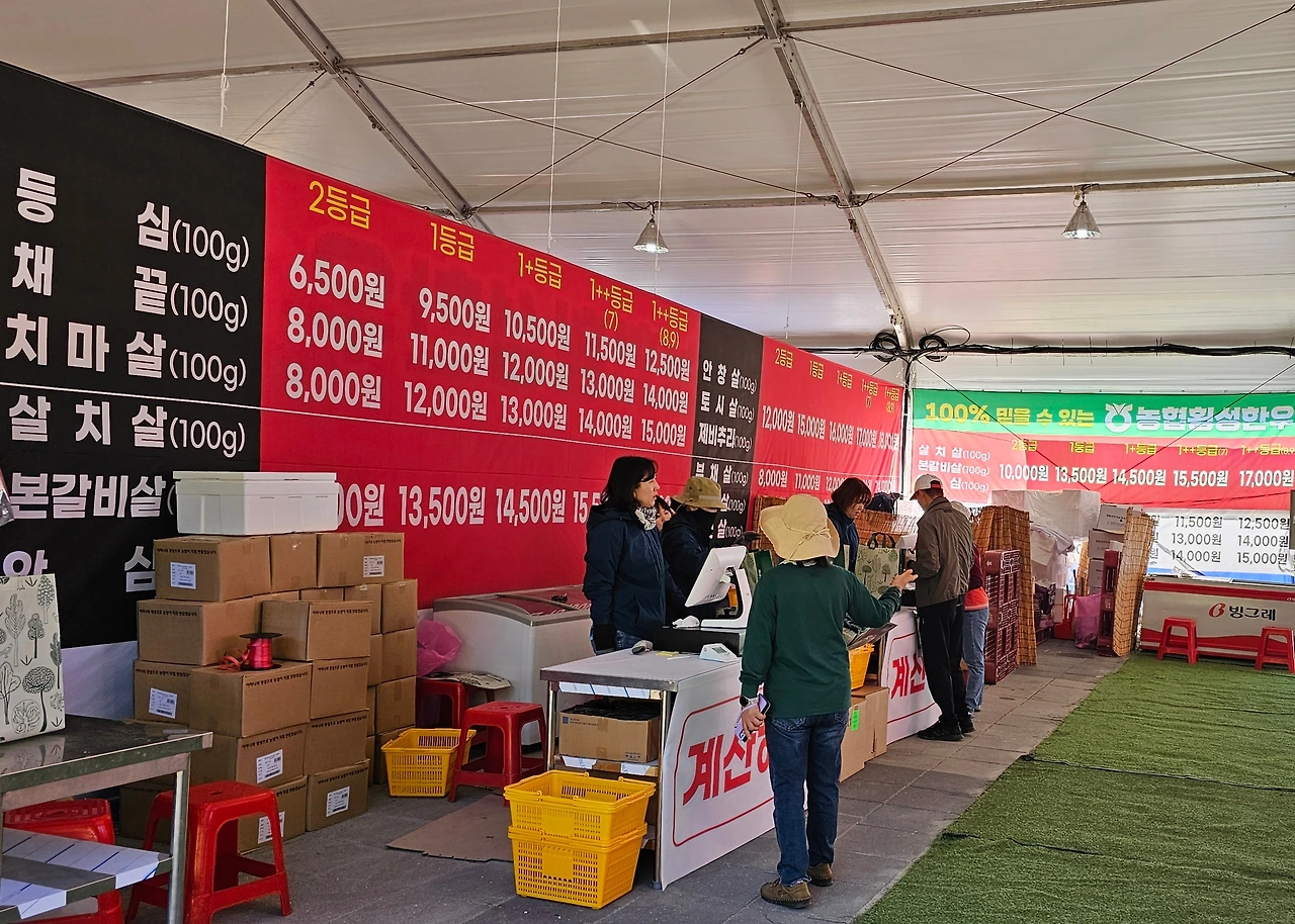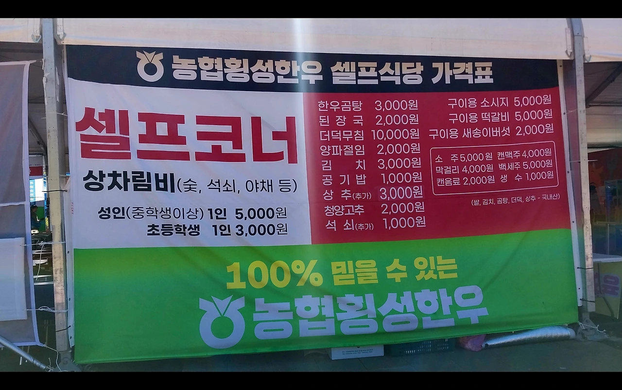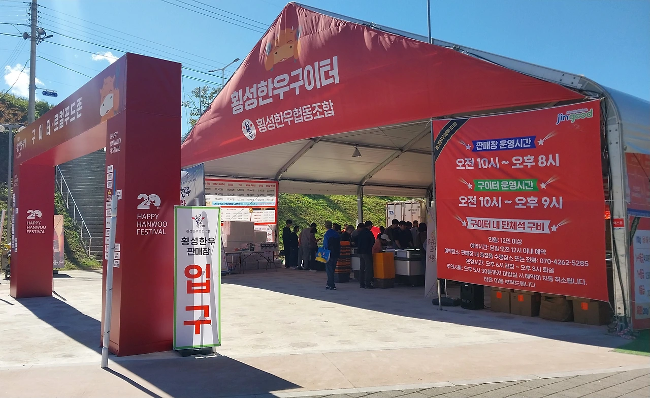 이곳저곳 돌아보는데 특별히 이 행사는 한우를 사서 현장에서 구워 먹는 행사로 한우고기 전시장에서는 한우를 좀 싸게 팔고 손님들은 그 한우를 가지고 구이전문 쪽으로 가서 원하는 야채나 양념등을 구매해 구워 먹는 횡성 한우의 우수성을 홍보하는 주된 목적이 있는 행사인 것 같다
