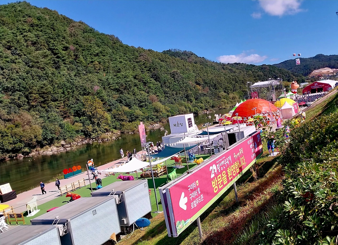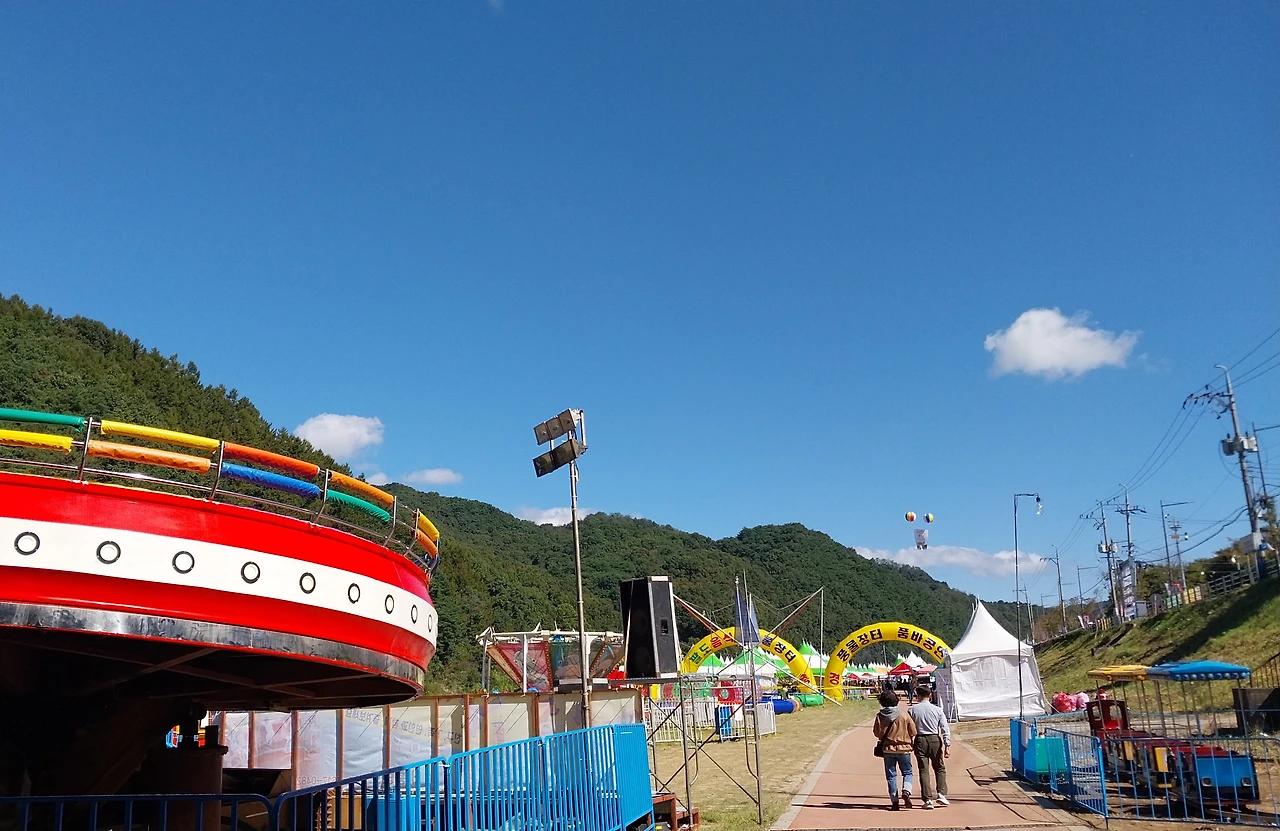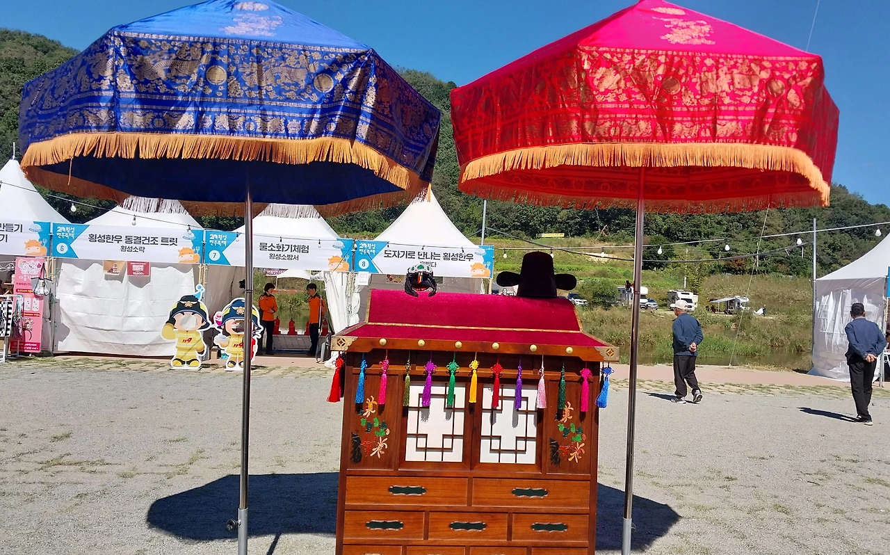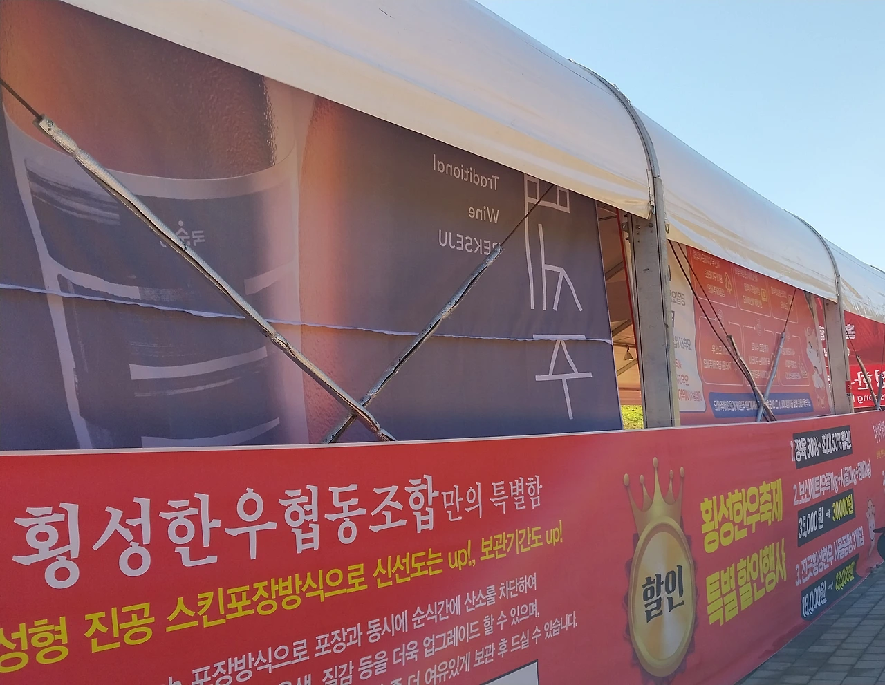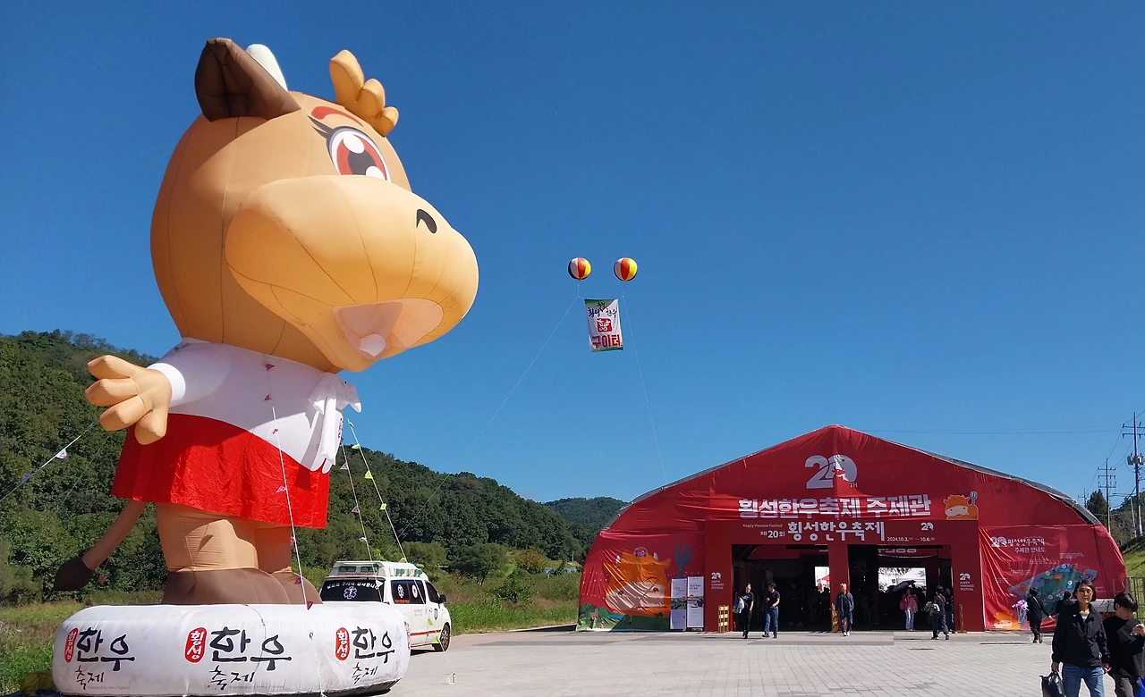 횡성 섬강가에 애드벌룬이 떠있고 알록달록 천막이 잔치가 열린다고 분위기를 띄우며 어서어서 많이들 와서 주머니를 열라 한다