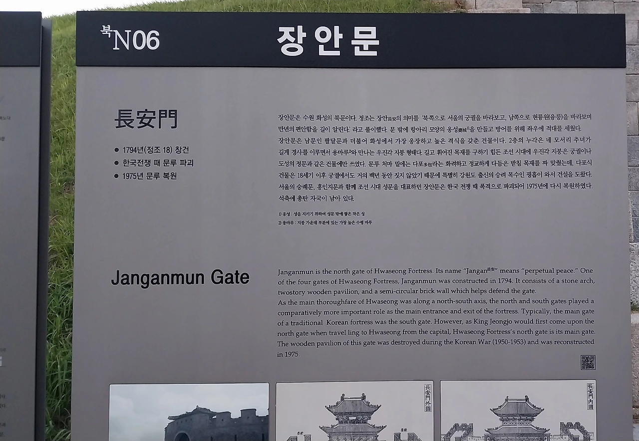 장안문ㅡ1794년 정조188년 창건. 수원화성의 북문 정조는 장안문을 북쪽으로 서울 궁궐을 바라뵤고 남쪽으로는 현룽원을 바라보며 만년 편안함을 길이 알린다는 뜻이라고.