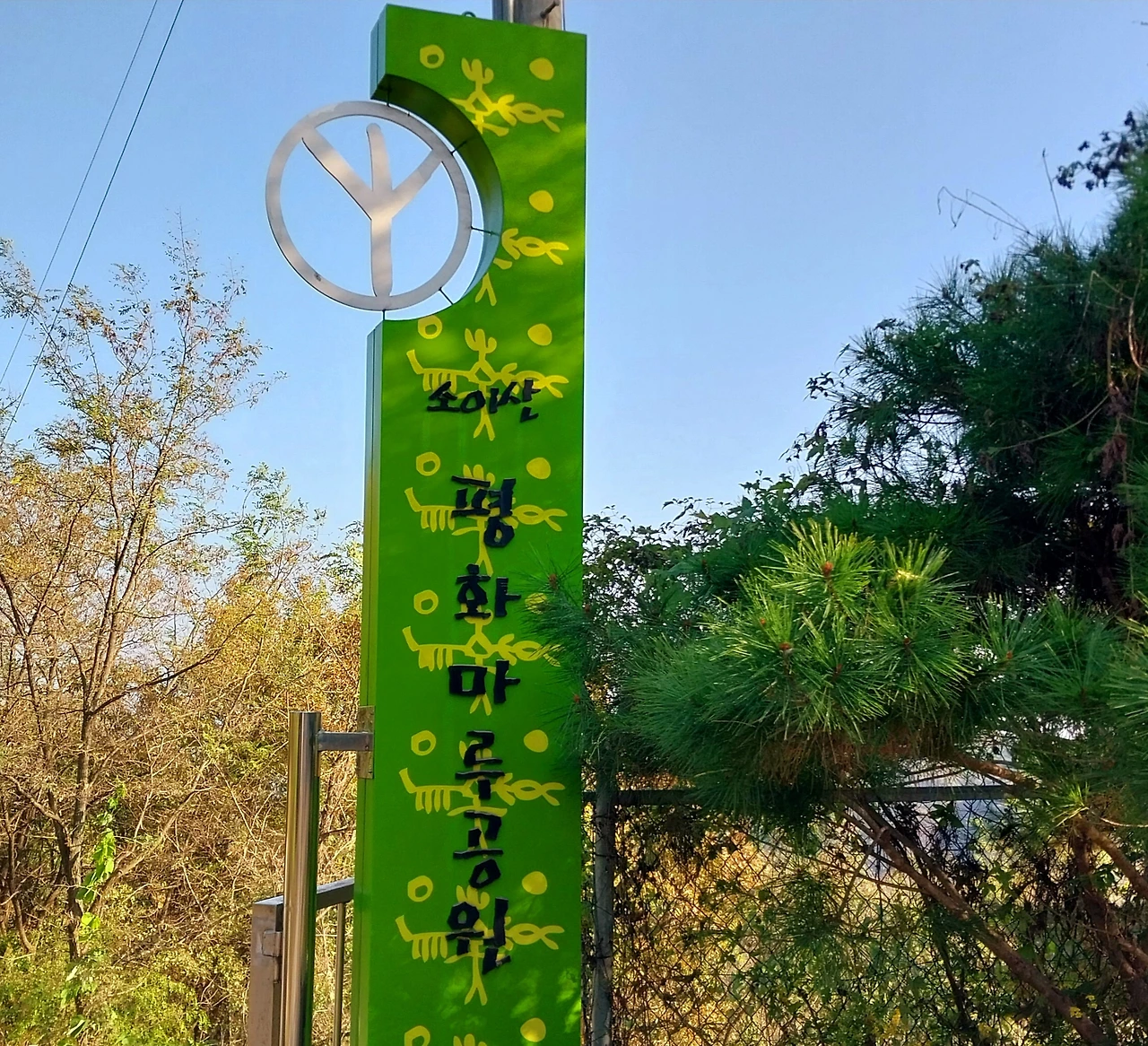 산 위로 올라 다시 내려가니 평화마루공원의 안내판이 우뚝 서 있어 그곳에서 또다시 계단을 오르니 넓은 데크 위에 별이 그려져 있고 눈을 들여보니