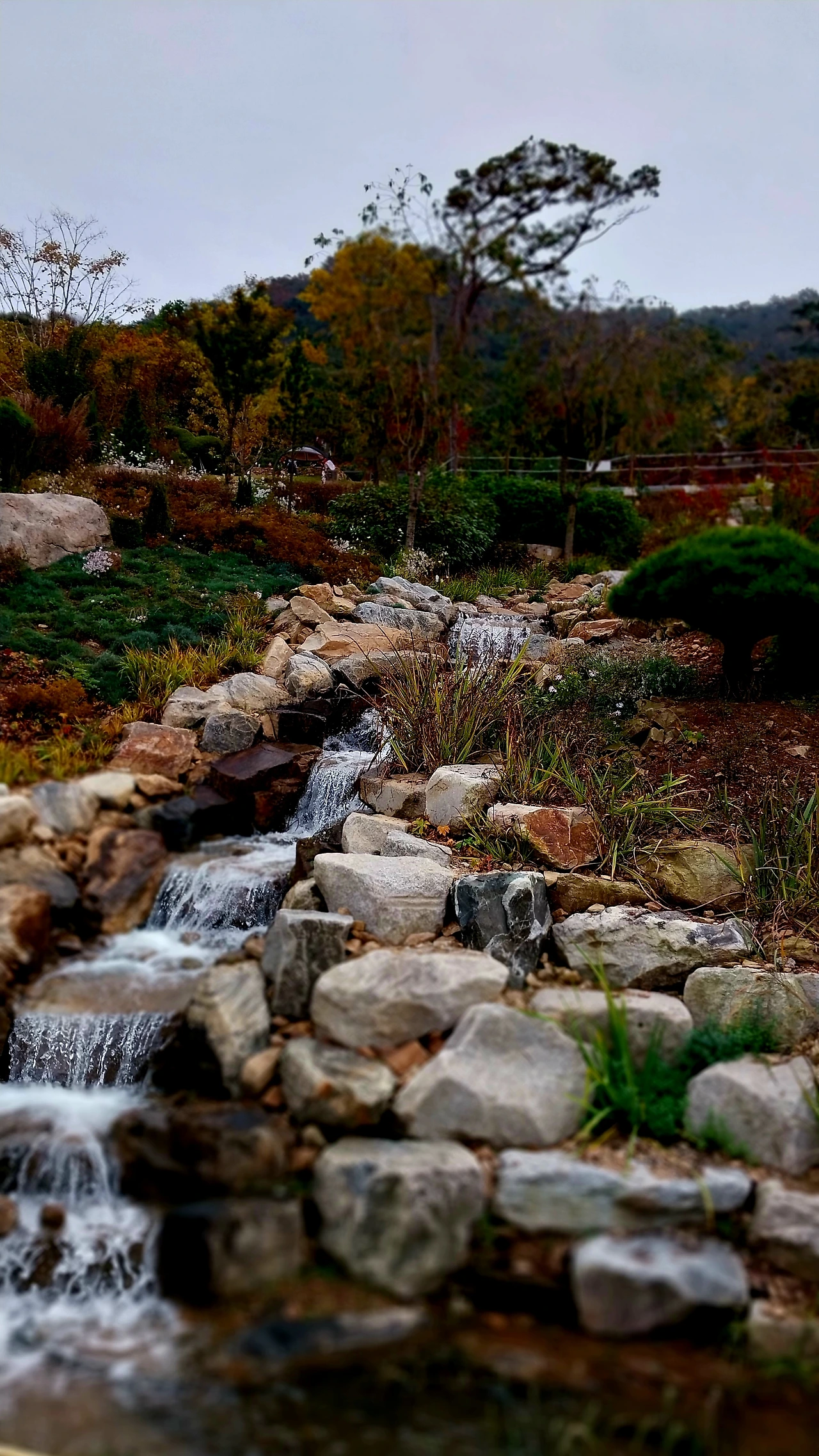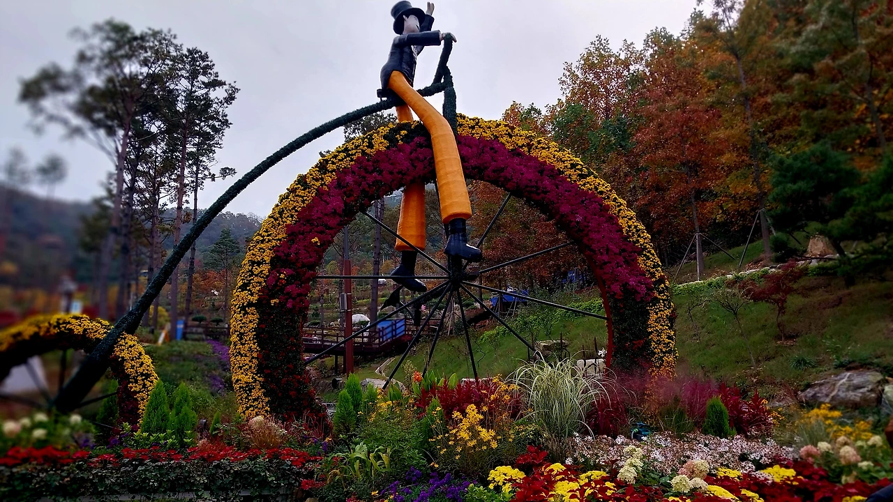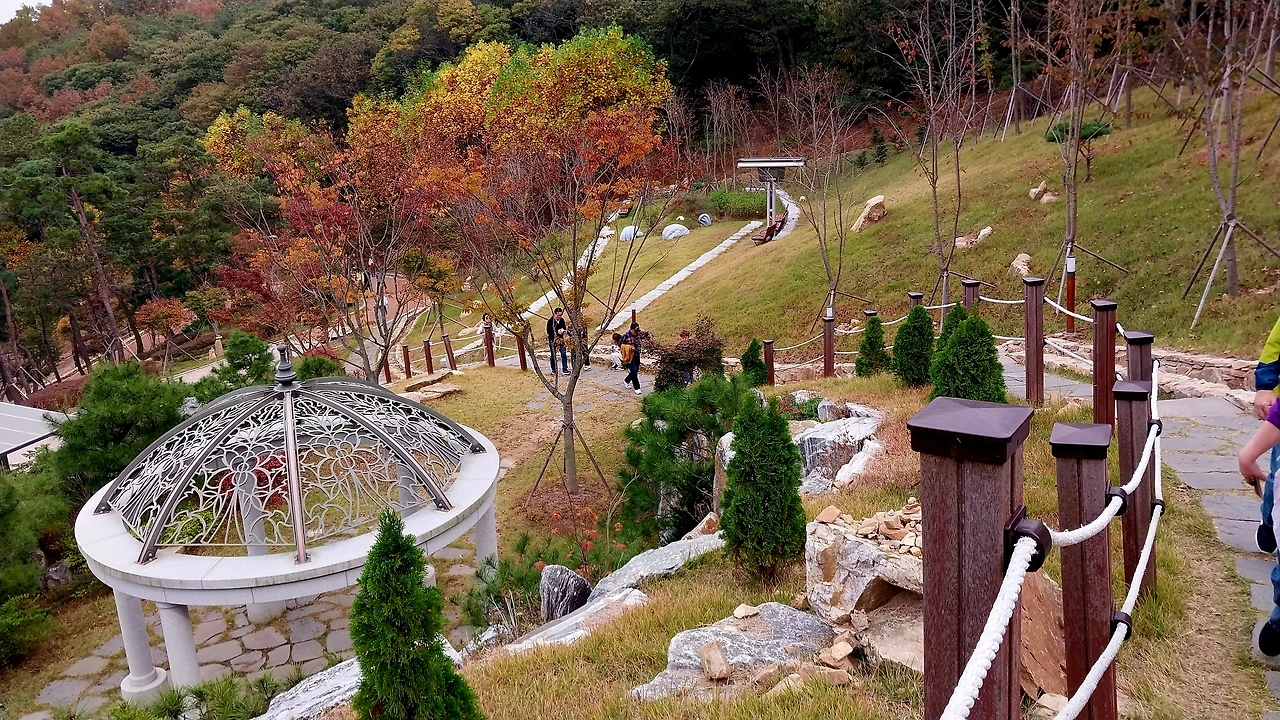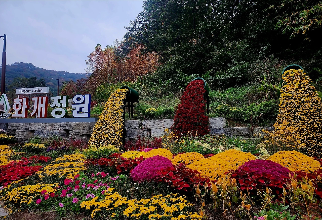 스카이워크를 걸었다고 서로 용기 있다며 칭찬도 하고 가을 노래도 부르며 화개산을. 내려와 다시 꽃들이 반기는 정원의 다른 길로 들어서자 커다란 이름표가 있다