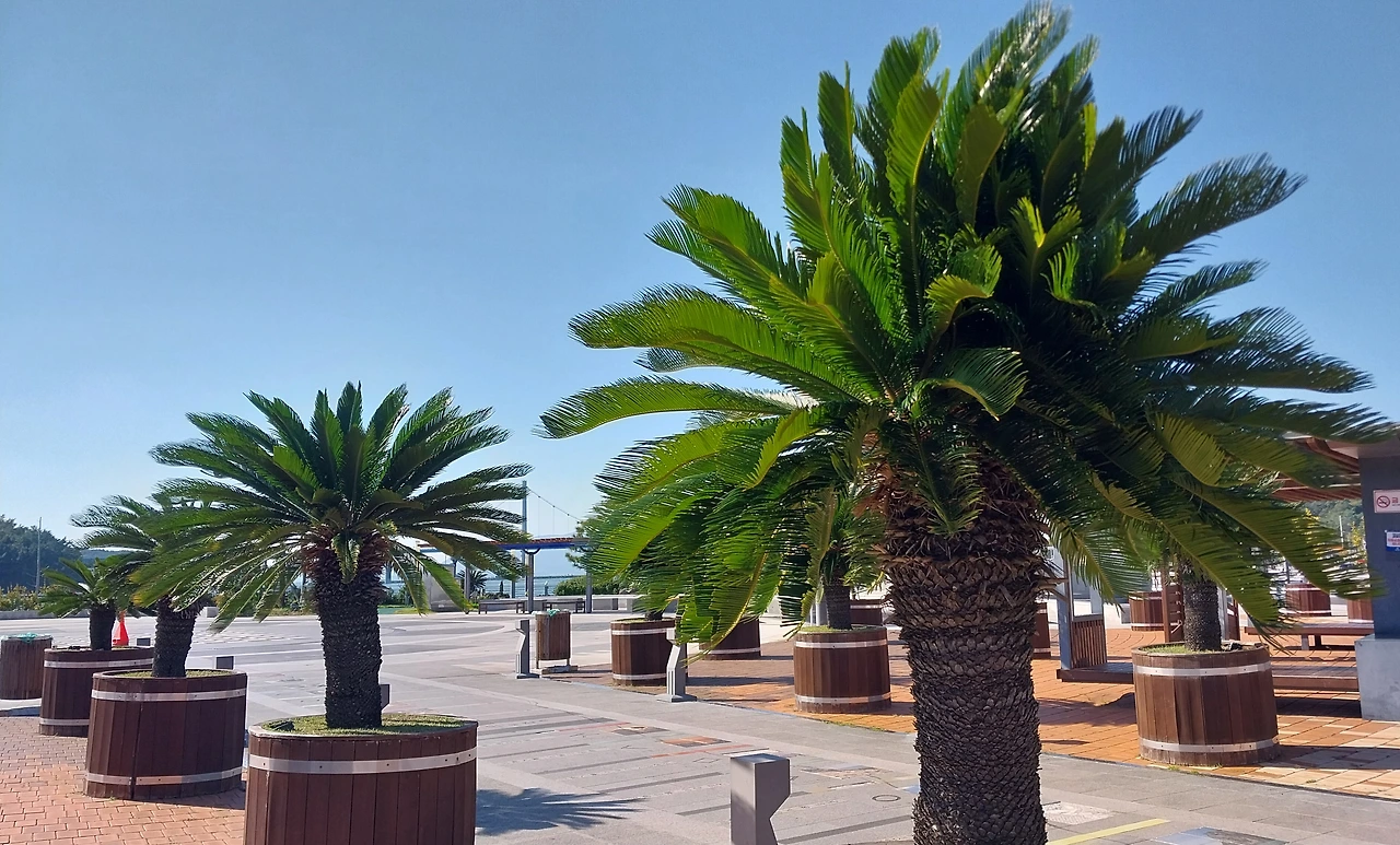 양옆으로 열대식물의 가로수를 배치하고 옆으로는 쉴 수 있는 벤치와 정자도 있다