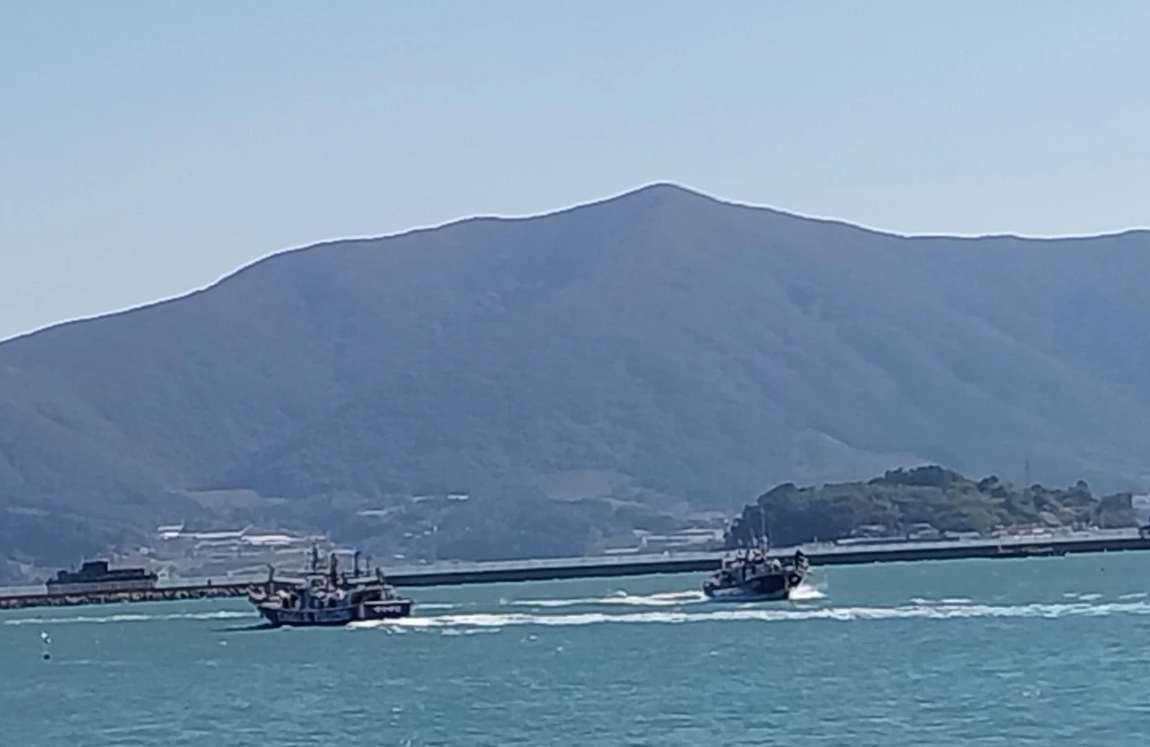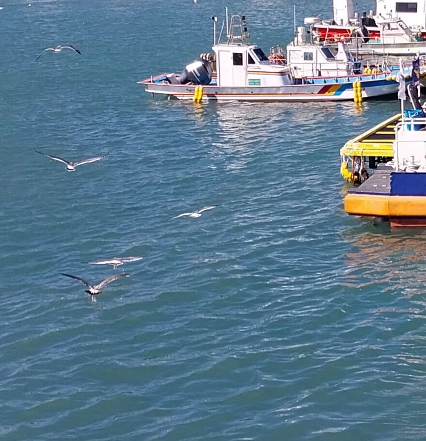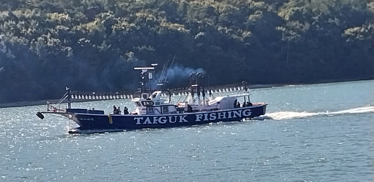 아침 바다에서 일하고 돌아오는 배를 따라 갈매기들이 먹거리가 있나 기웃대며 배위를 날고 있다