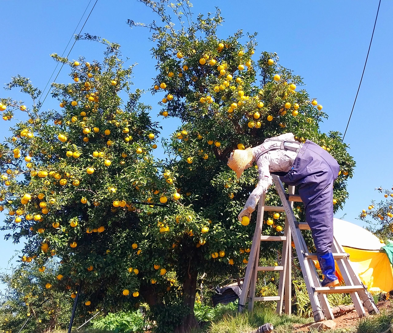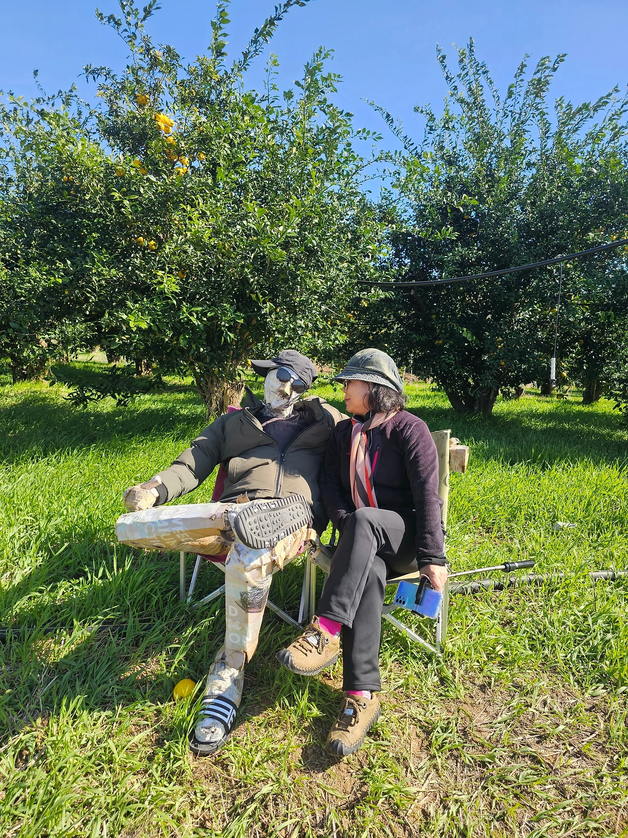 어르신의 친절에 감사하며 알려주신 동산 위로 올라가니 산 위에 엄청난 유자과수원에 샛노란 유자가 주렁주렁 열린 사이로 행사야경을 위한 전기시설이 되어 있었고 걷기 위한 길이라며 알록달록 부직포도 깔아 두어서 행사 전 식전행사차 우리가 먼저 걷는 격이 되었다며 활짝 웃었다