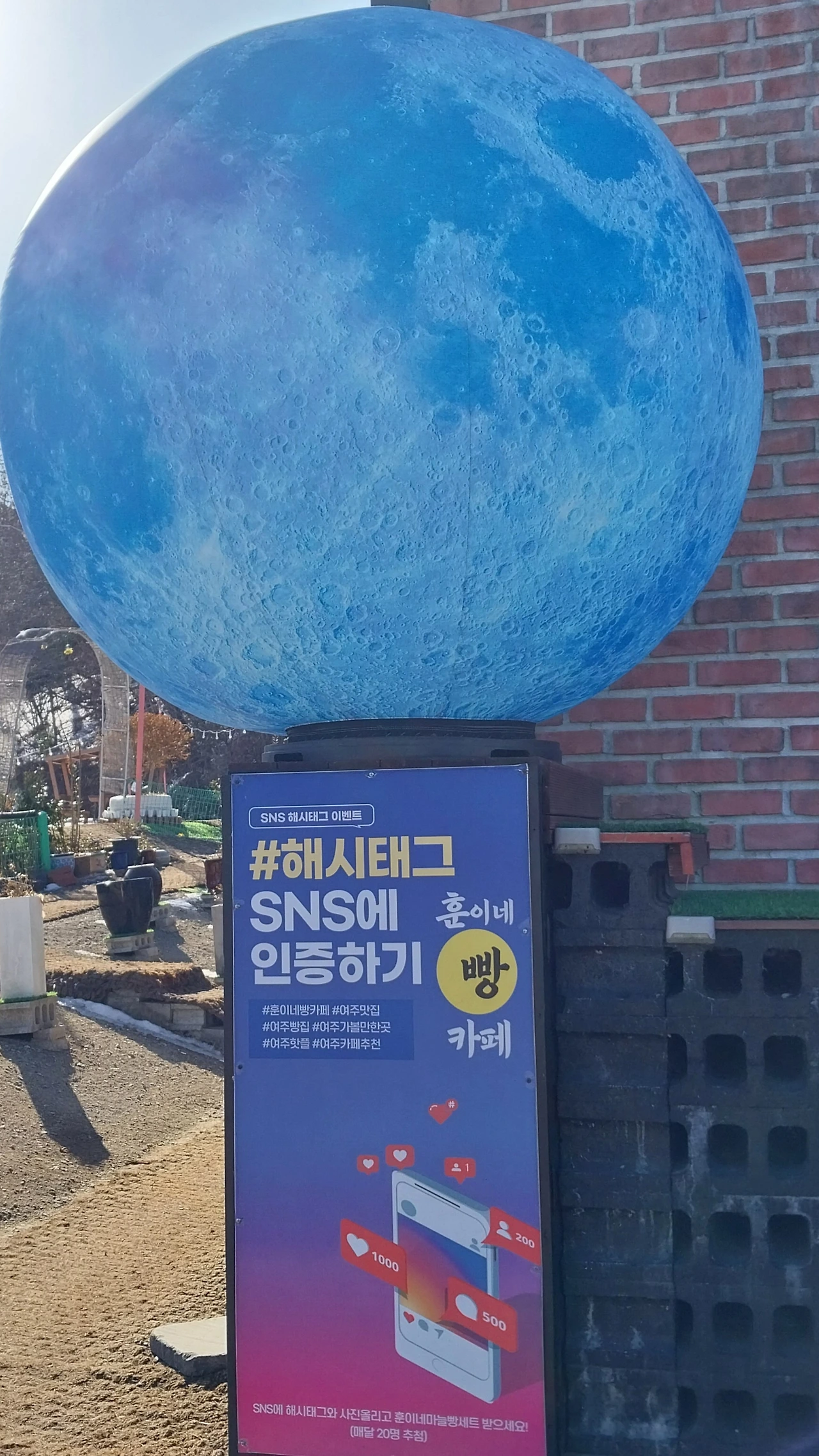 가게 앞에 커다란 지구가 떠있고 해시태그 Sns인증하기라는 입간판이 눈길을 끌며