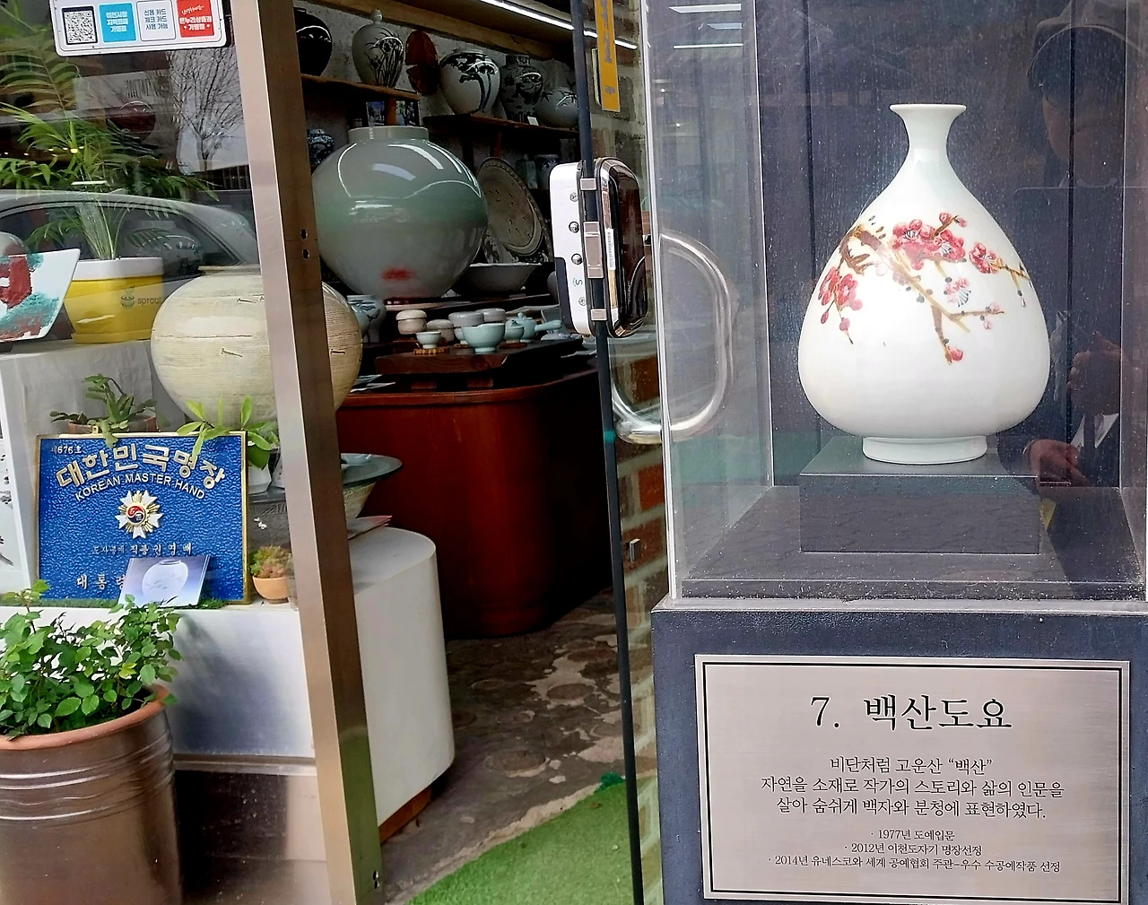 얘기를 나누다 도자기옆 진열장 안에 있는 액자에 대통령으로부터 받은 제676호 대한민국 명장증이 있었다