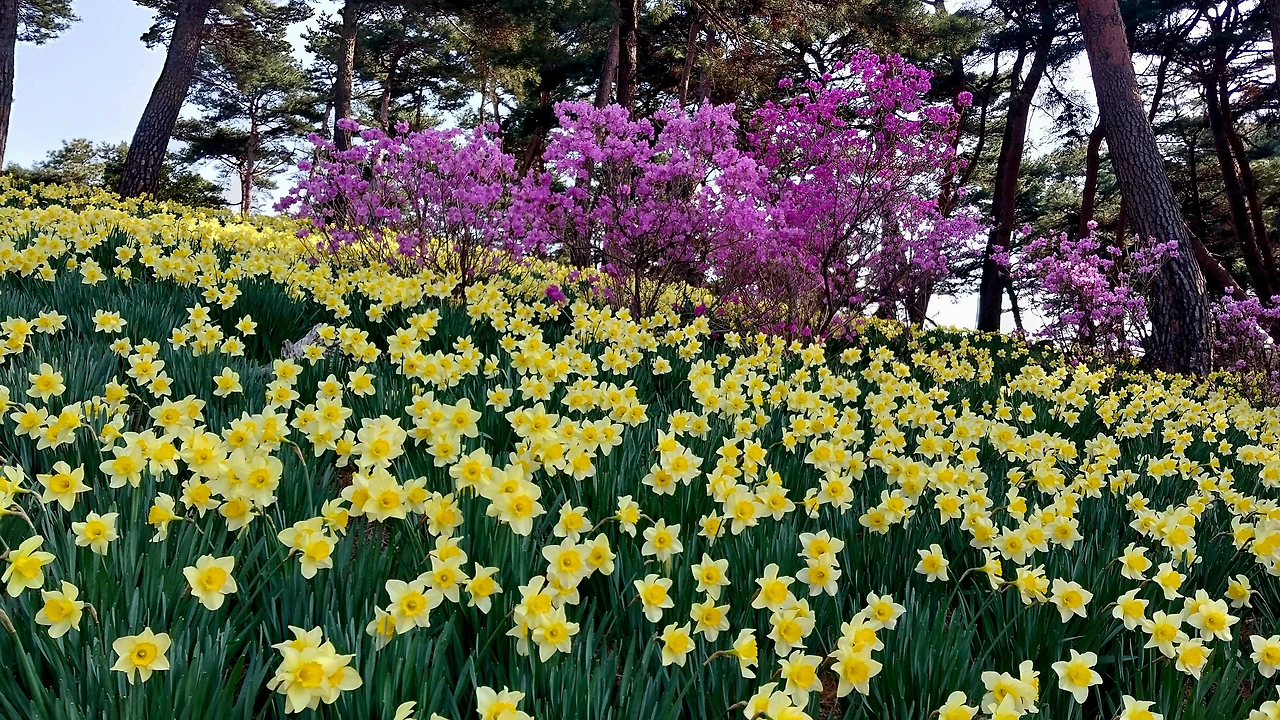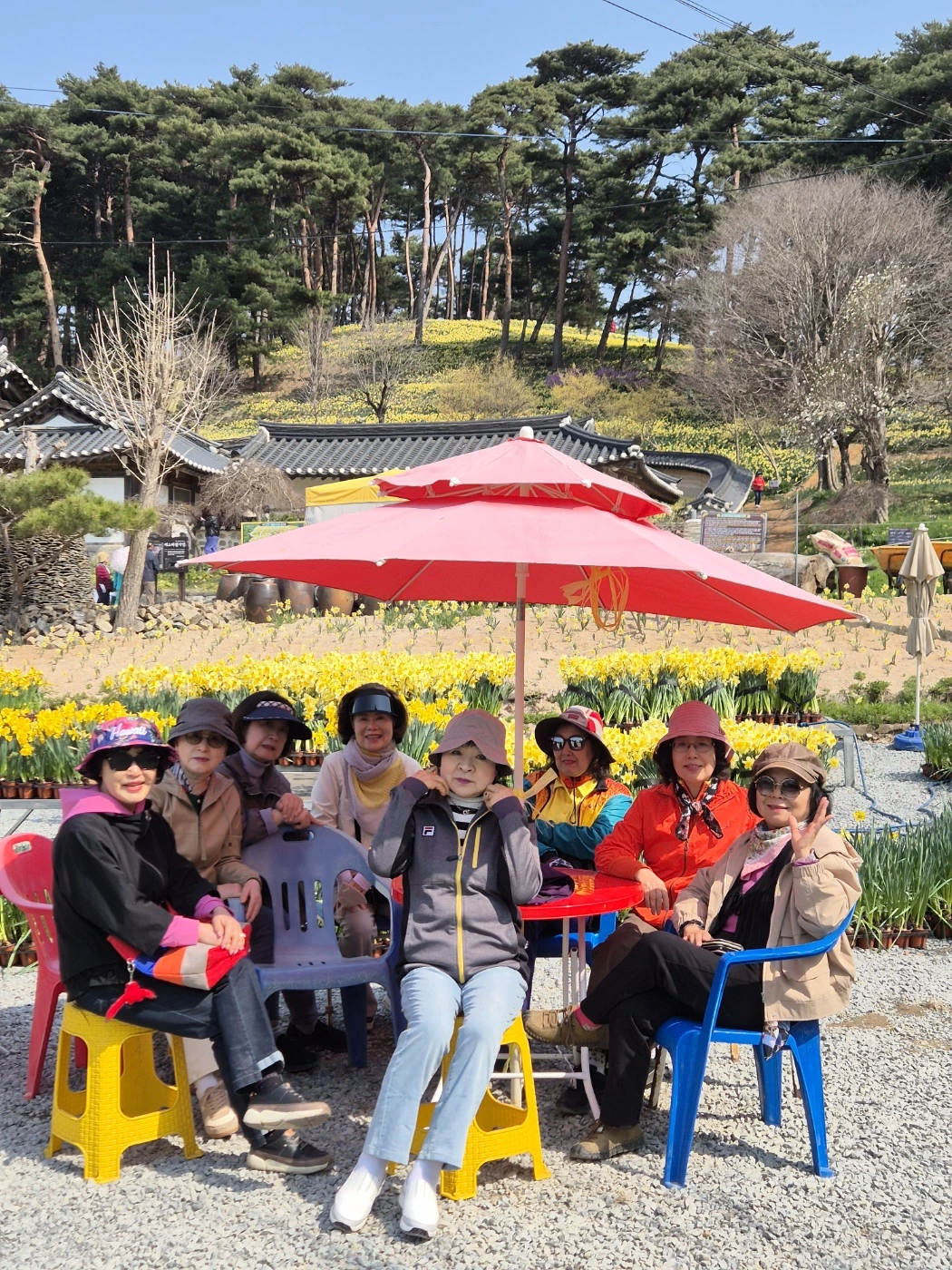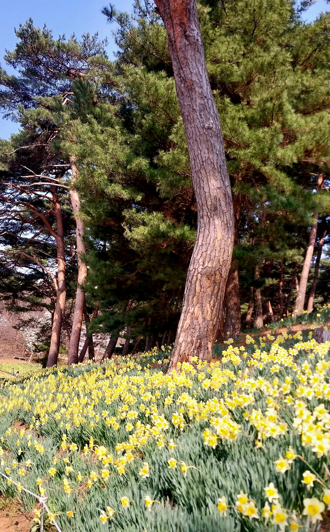 유기방가옥을 돌아보고 샛노란 수선화의 능선 따라 소나무 숲 산등성이를 장식한 수선화꽃 숲에서 더 예쁘게, 더 멋지게 포즈도 취하며 모두가 저 멀리 떠나간 소녀를 불러와 가슴에 담고 밝은 미소를 짓는다