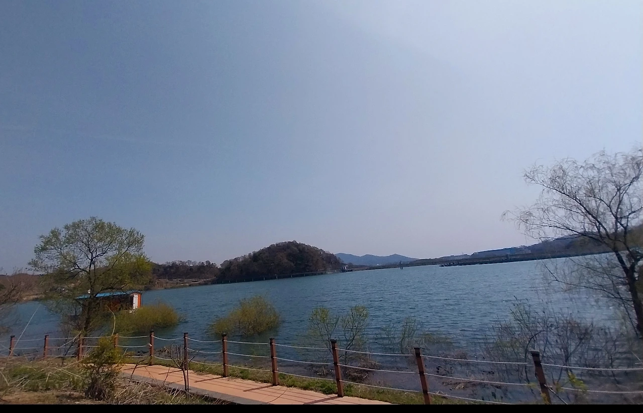 저수지 중간쯤인가? 아름다운 풍경을 더욱 빛나게 하는 푸른 섬?