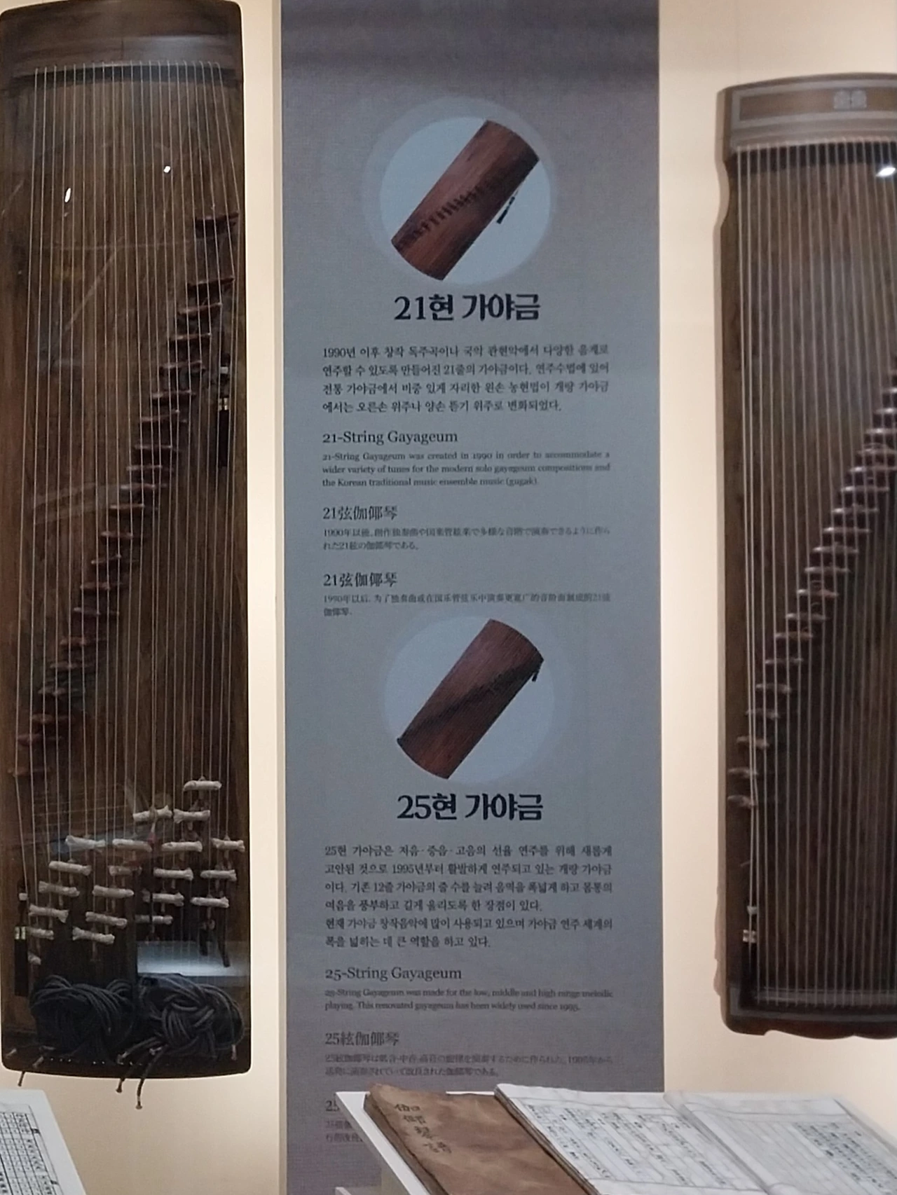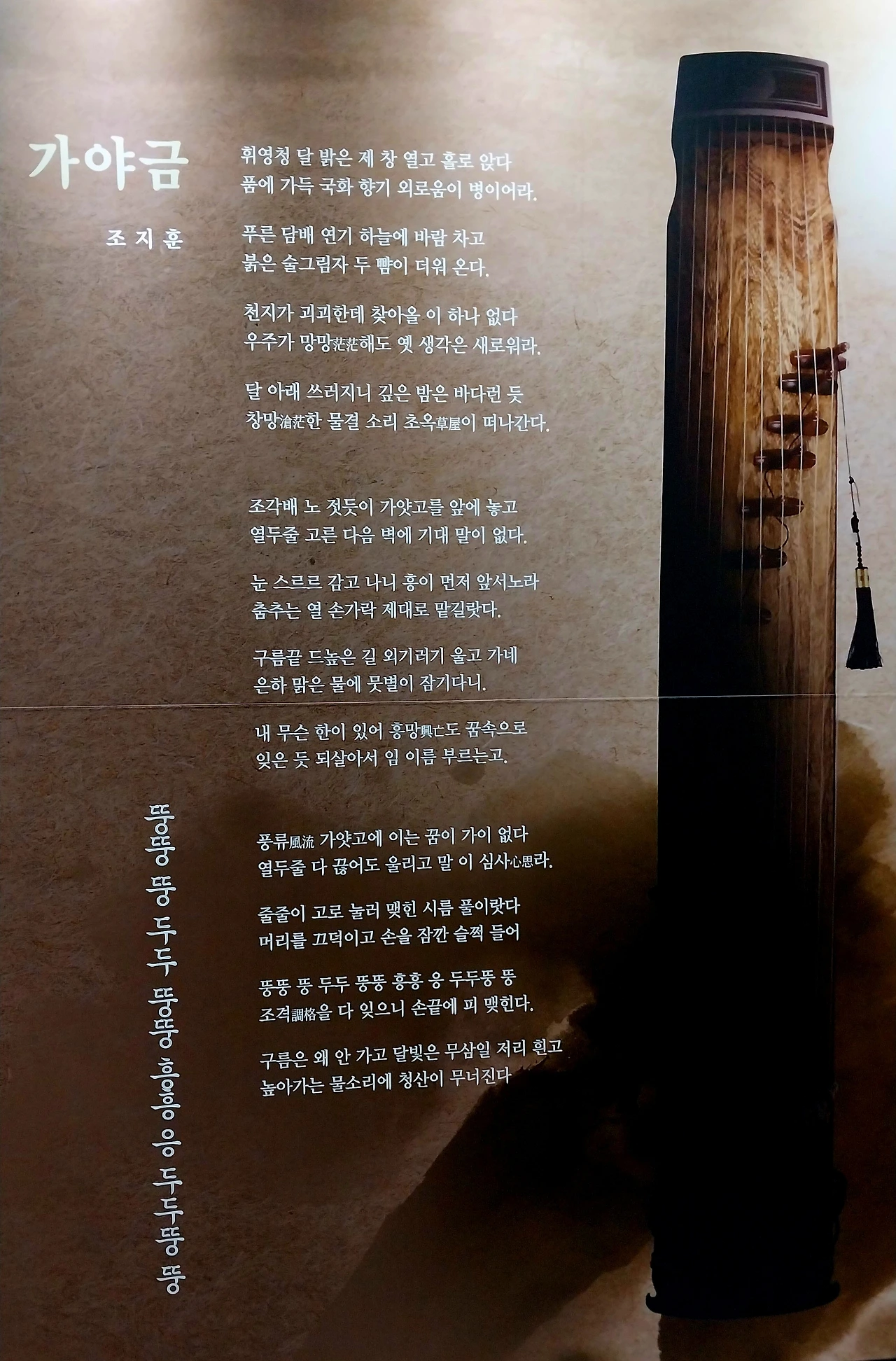 천천히 돌아보며 비치해 둔 가야금의 종류를 구분해 보고 가야금에 문외한인 눈으로 산조 가야금, 정악 가야금, 18현 가야금, 21현 가야금. 25현 가야금등 가야금의 종류가 다양함을 살펴보았으며 돌아 나오는 길목에 조지운 님의 시 ㅡ가야금ㅡ에 발길이 잡혔다