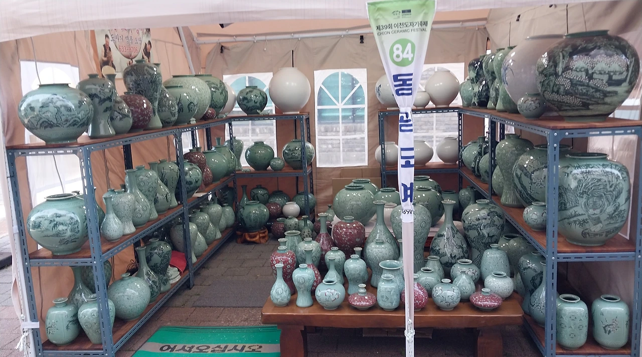 구경을 하다 보니 이천 사기막골에서 보았던 청자가 가장 많던 동광도예도 가판대를 이용하고 있었는데 그곳에서 부녀로 보이는 분들이 청자 구매에 망설이고 있었다 도예장님은 정말 팔리지 않아서 그냥 가져가는 것보다 싸게 드린다며 청자