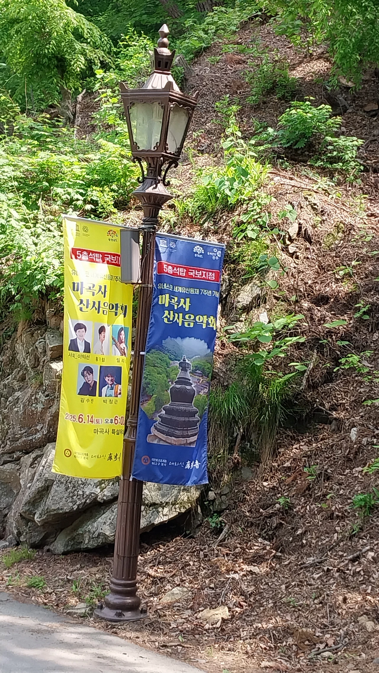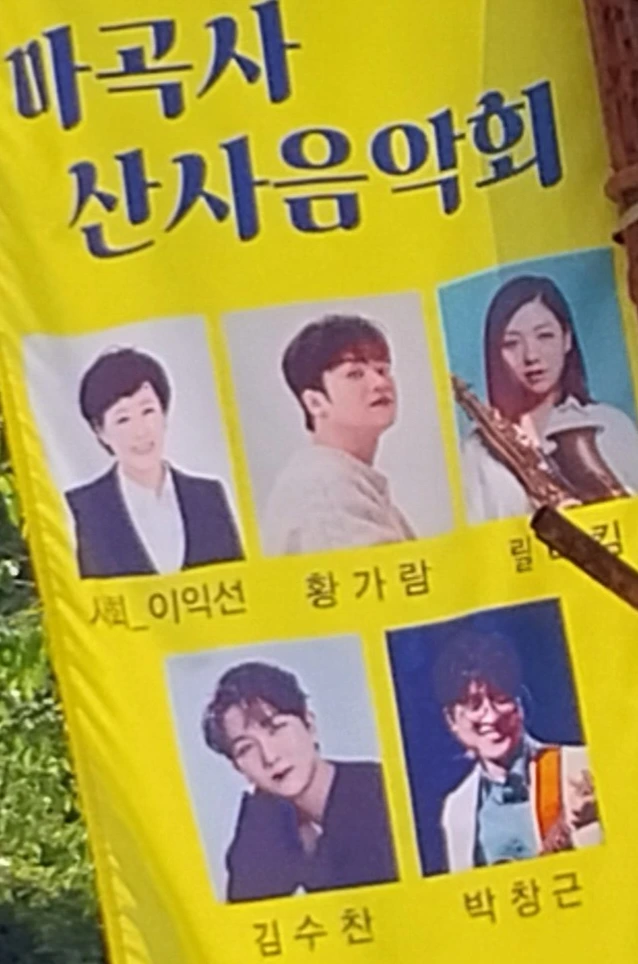마곡사 입구의 아름다운 길가에 밝음으로 휘날리며 산사 음악회를 알리는 플래카드의 사진 속에 활짝 웃는 모습의 황가람가수의 얼굴과 박창근 가수의 모습이 있었다