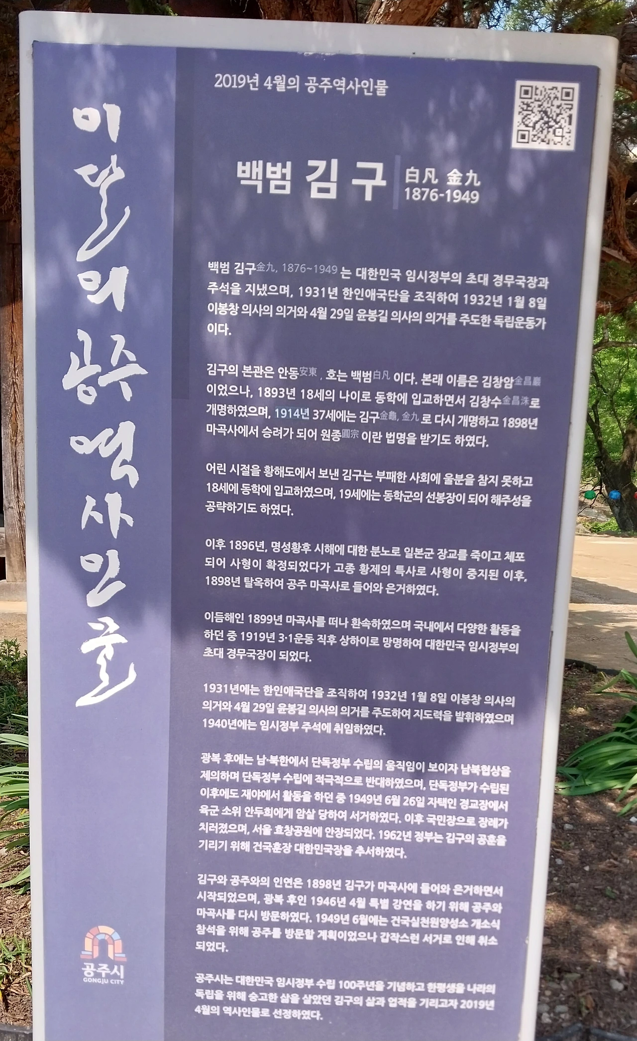 향나무 앞에는 선생에 대한 기록을 알리고 있어 살펴보니 1896년 명성황후 시해사건으로 분노하여 황해도에서 일본군장교를 살해 후 투옥되었으나 1898년 탈옥하여 이곳저곳 전전하다 마곡사에서 은거하며 원종이라는 법명으로 머리를 깎고 잠시 수도하였다는 사실도 알리고 있었다