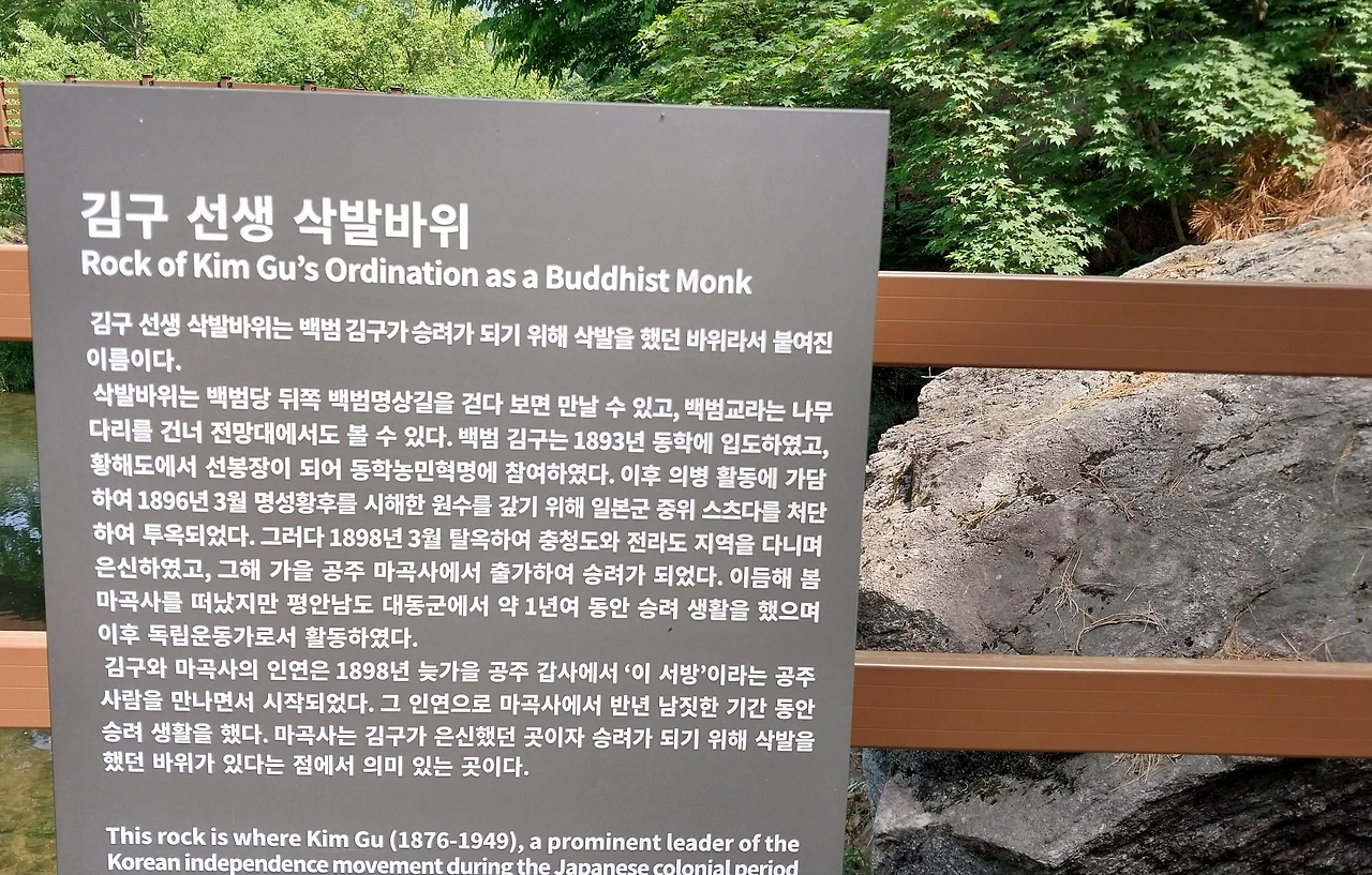 또 성보박물관을 나와 개울을 건너는 다리를 지나니 그곳 바위에서 김구선생이 수도를 위해 삭발을 한 바위라는 내용과 삭발을 위해 상투를 잘랐을 때 눈물을 흘렸다는 내용을 보며 독립운동을 해야 하는 귀한 시간에 은거를 위해 삭발을 하고 있는 자신의 모습이 얼마나 안타까웠을까 라는 숙연함에 고개를 숙였다