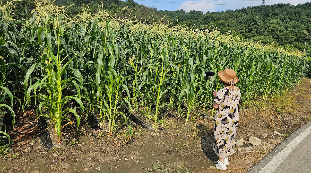 두 시간여의 시간 후 도착한 시골 농촌 옥수 밭이 반기는 주차장 없는 시골길