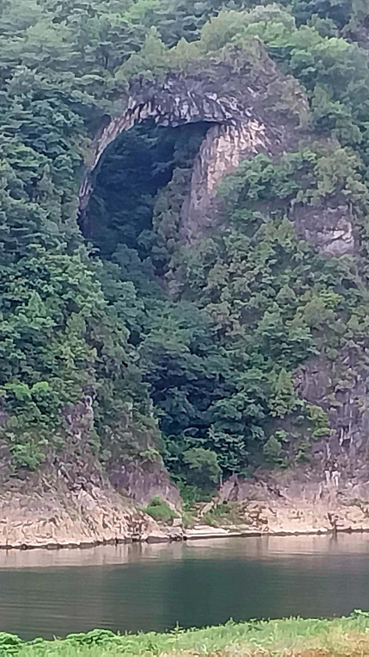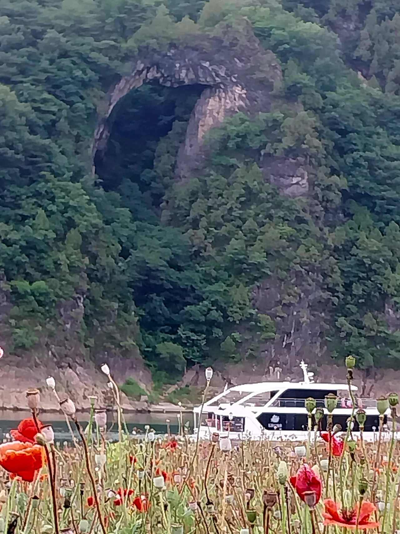 예전에 석문 위로 올라가 보았지만 정면이 이렇구나라고 감탄하고 있는데 때맞추어 유람선이 그 옆을 스치듯 떠가고 있는 모습은 절경이었다