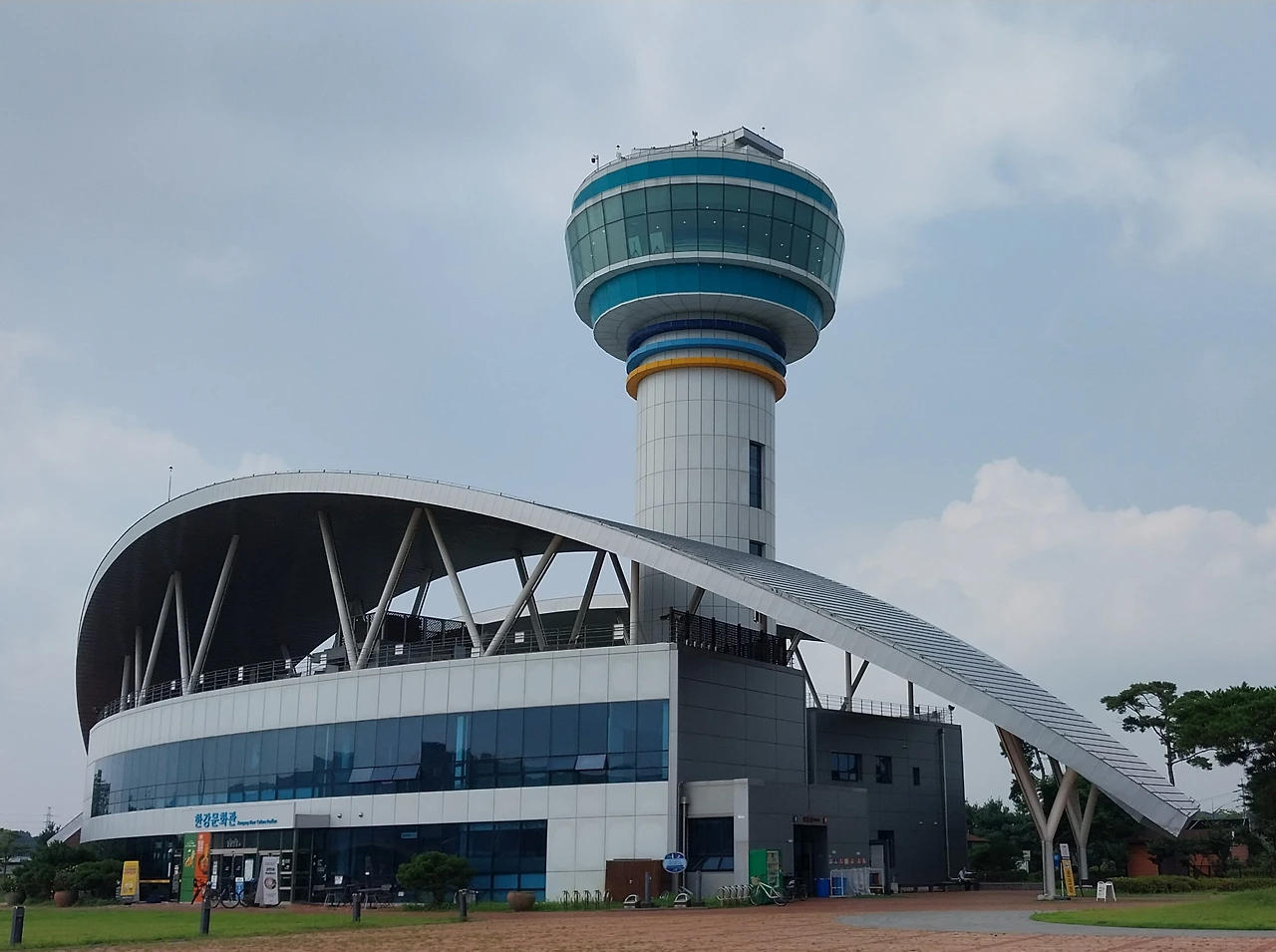 멋스러운 전망대가 높고 특이한 형태의 건물이 보인다