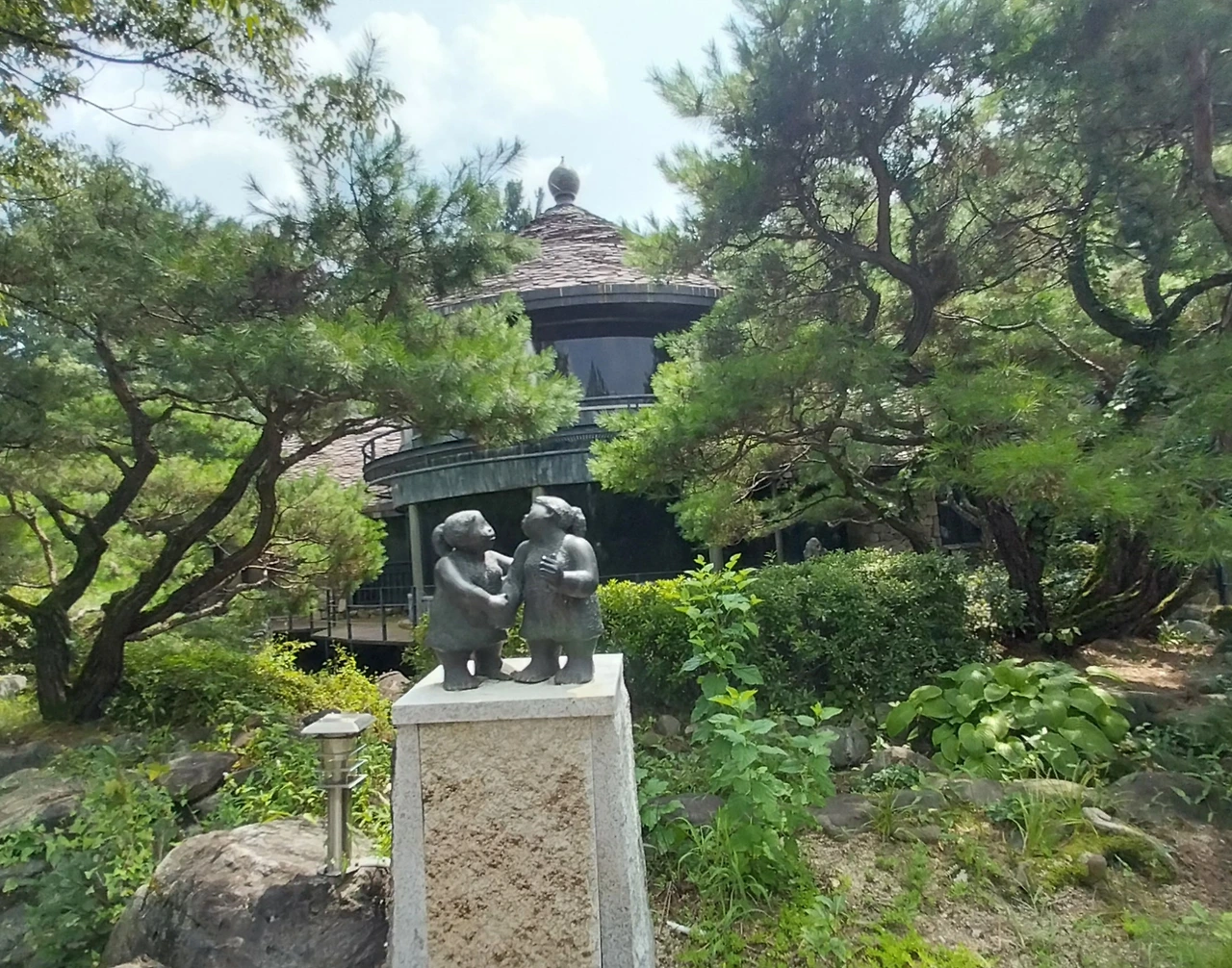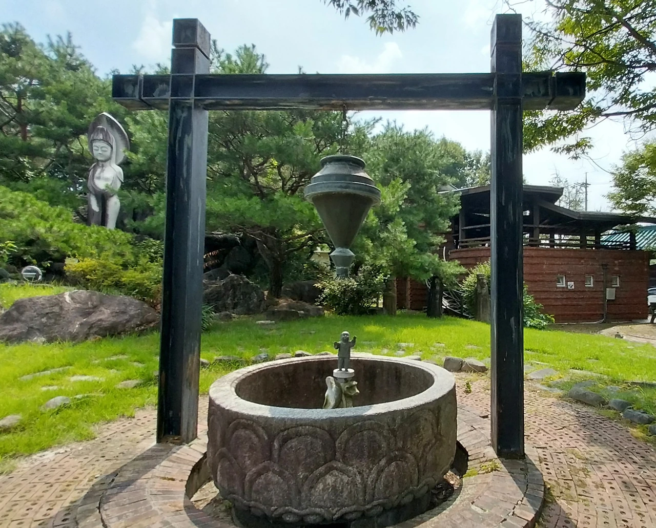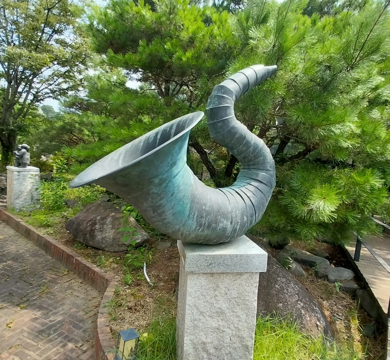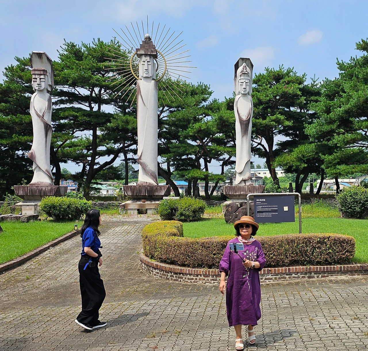 붉은 기둥으로 된 하늘문 교회와 기둥교회 안에 십자가에 못 박힌 예수상이 걸려있고, 그 뒤쪽으로 천주교의 상징처럼 된 성모상이 있어 마음 편하게 정원의 작품들을 조금은 엄숙한 마음으로 돌아보고 살펴보는데
