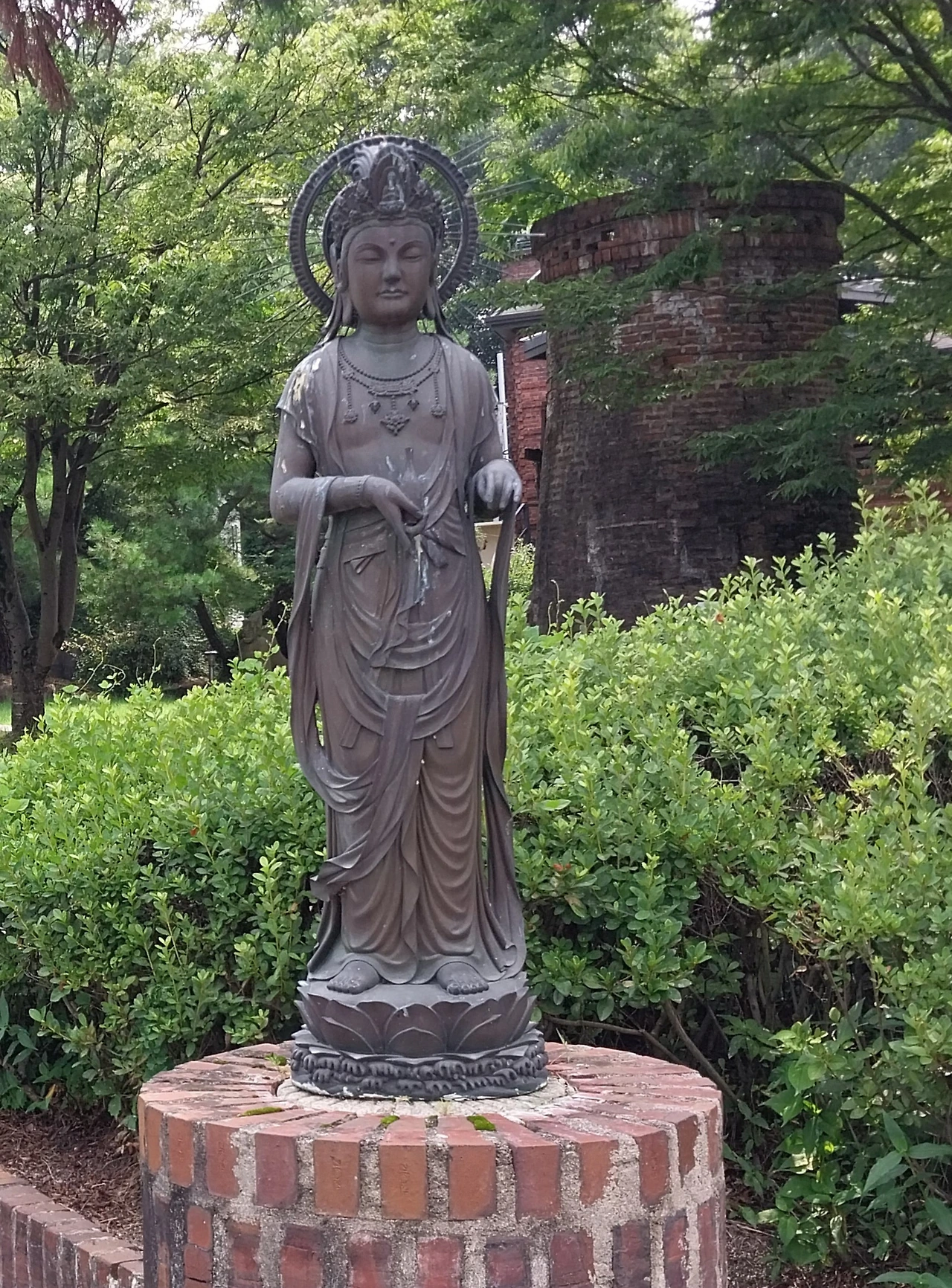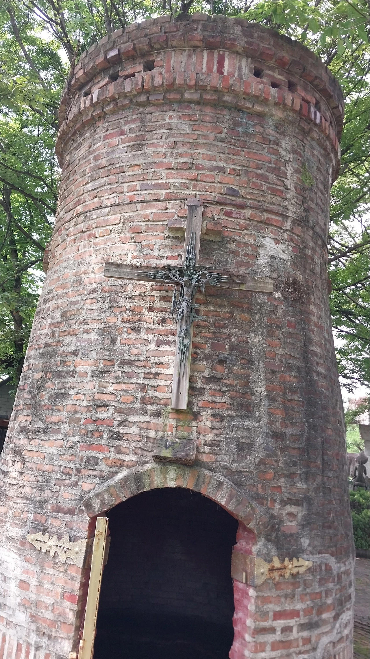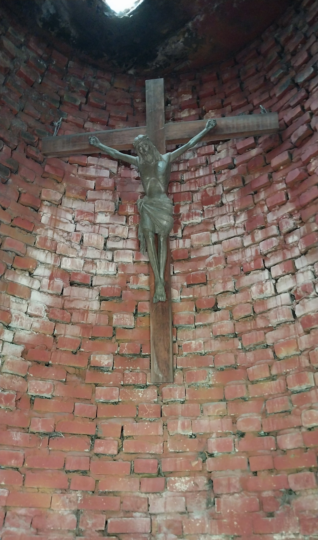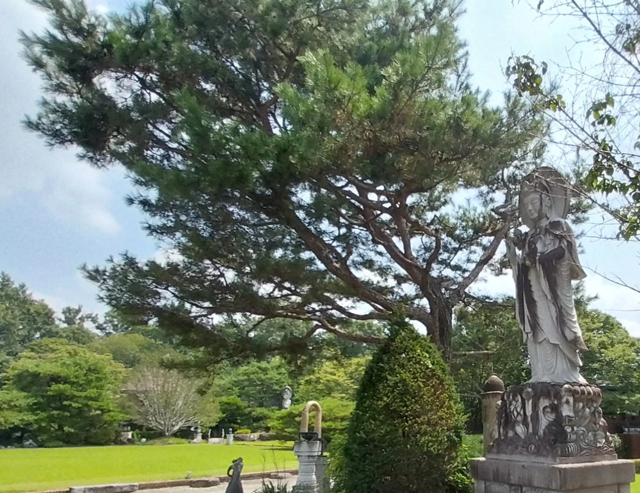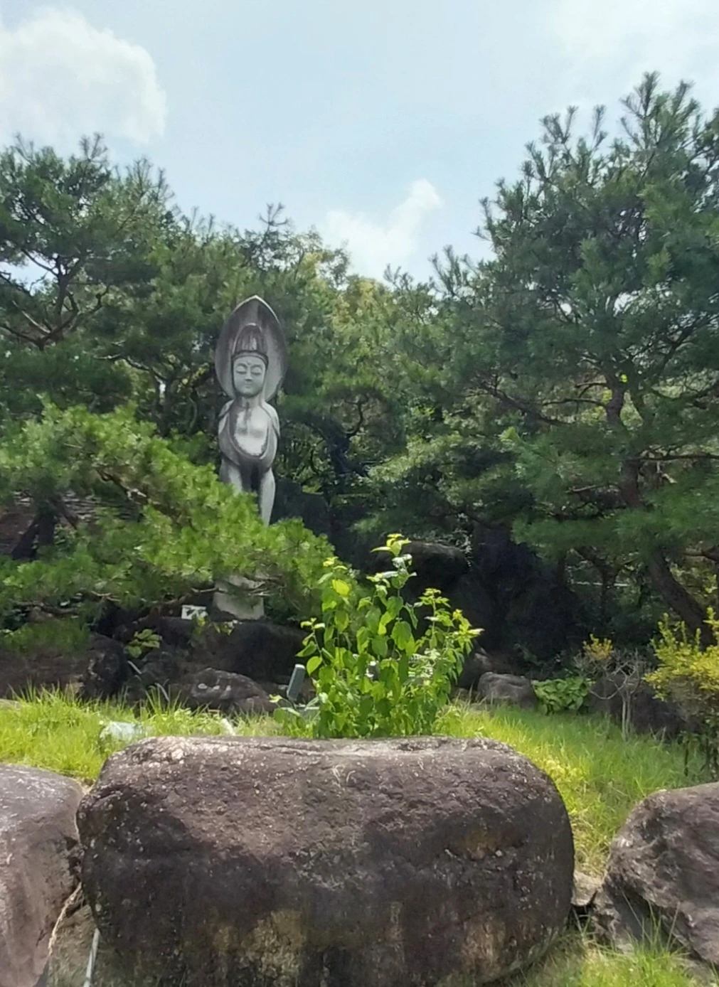 붉은 기둥으로 된 하늘문 교회와 기둥교회 안에 십자가에 못 박힌 예수상이 걸려있고, 그 뒤쪽으로 천주교의 상징처럼 된 성모상이 있어 마음 편하게 정원의 작품들을 조금은 엄숙한 마음으로 돌아보고 살펴보는데