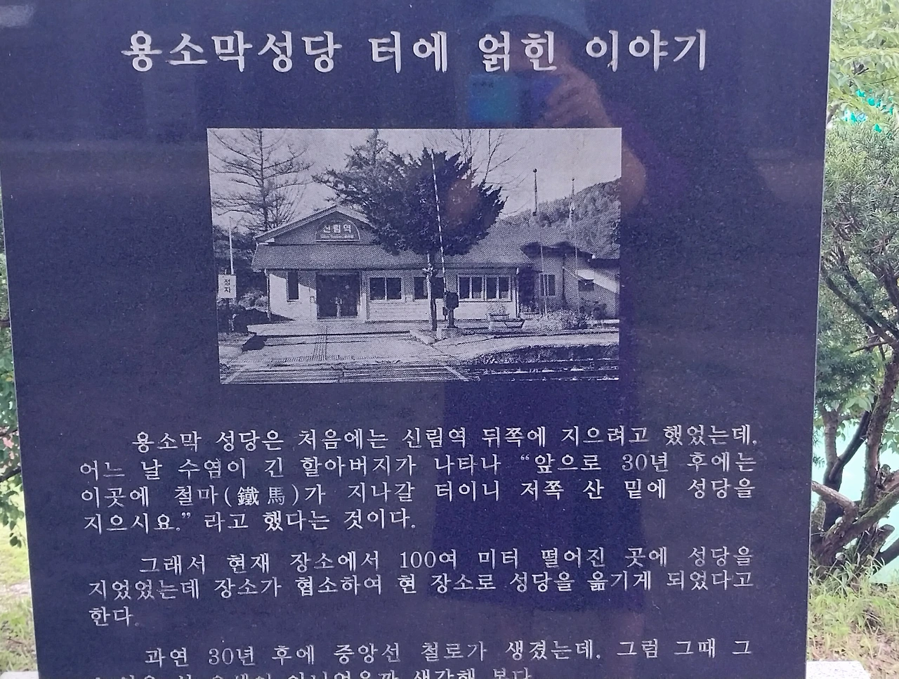 ㅡ용소막 성당은 처음에 신림역 뒤쪽에 지으려 했는데 어느 날 수염이 긴 할아버지가 나타나 앞으로 ㅡ30년 후에는 이곳으로 철마가 지날 것이니 저쪽 산 밑에 성당을 지으시오ㅡ라고 했다는 것