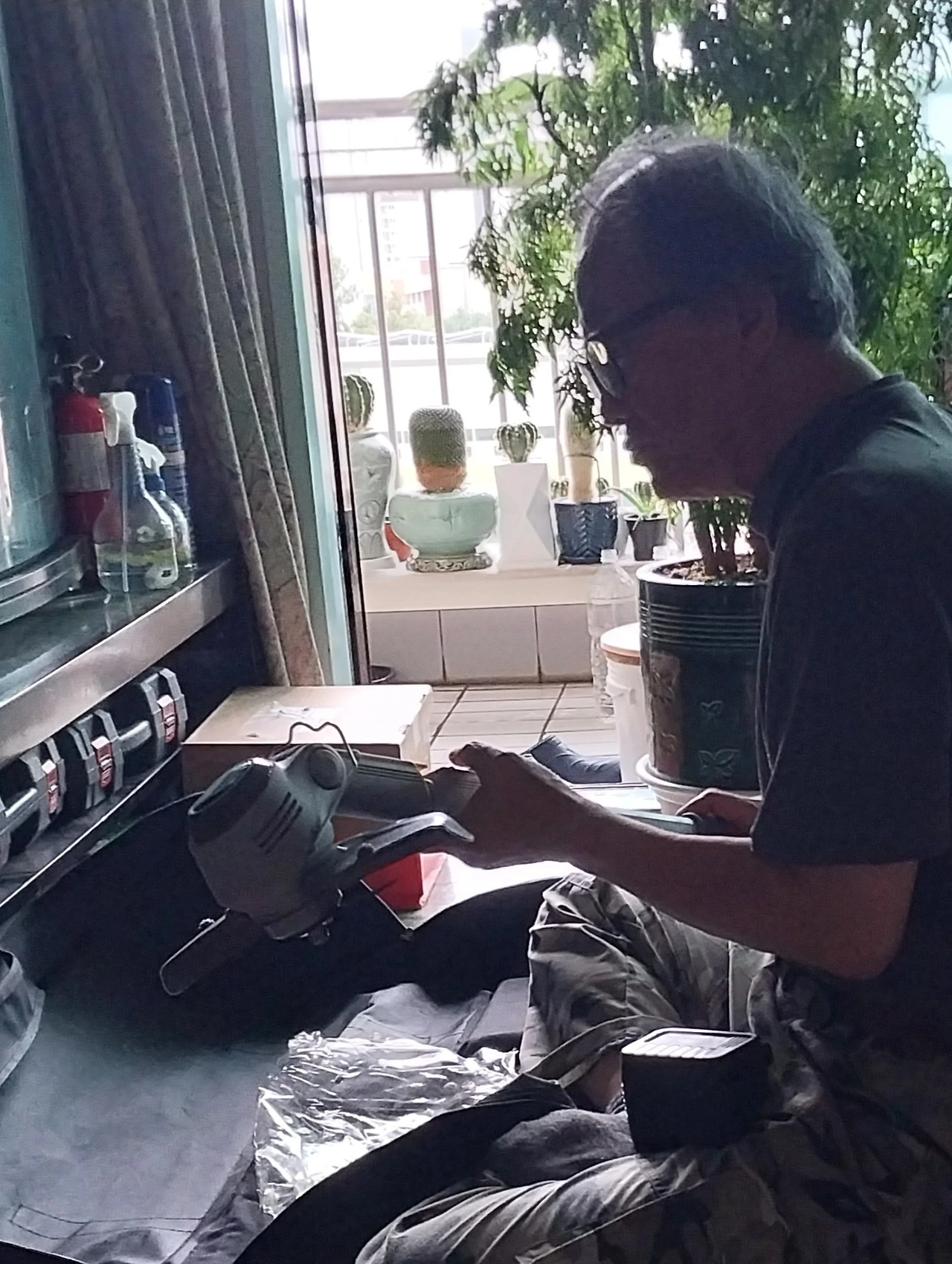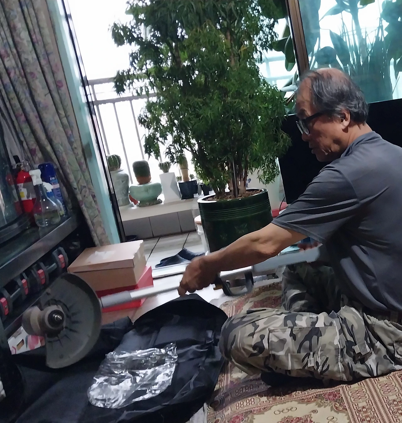 조상님 묘소에 벌초를 가야 한다며 예초기 가방을 꺼내와 기계 점검을 하고 있다