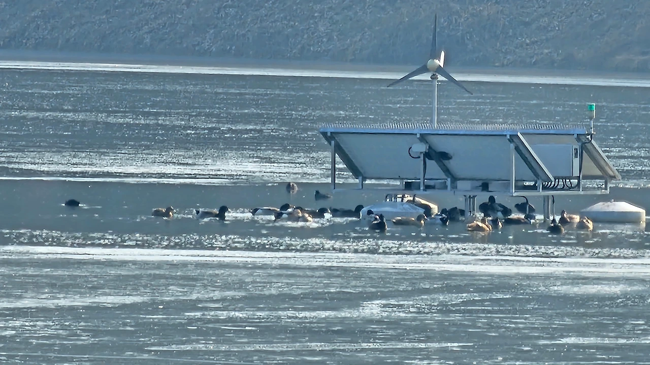 인위적 물속 바람개비 임무수행에 바쁘고 덕분에 즐긴다는 오리 떼들 모두 모여 쾍쾍대며 물장구 즐기는 모습 신바람 났다